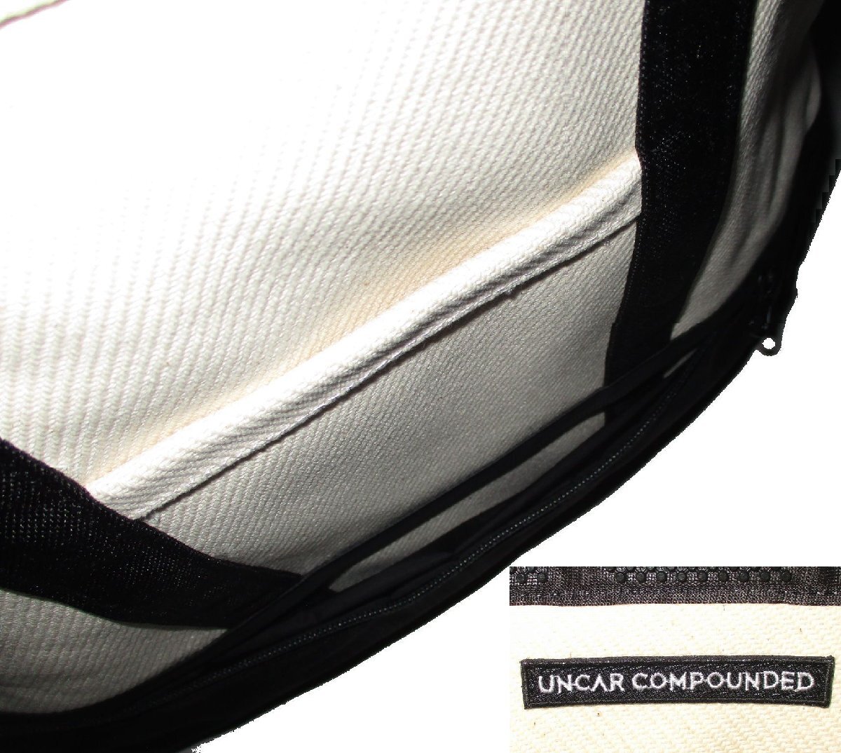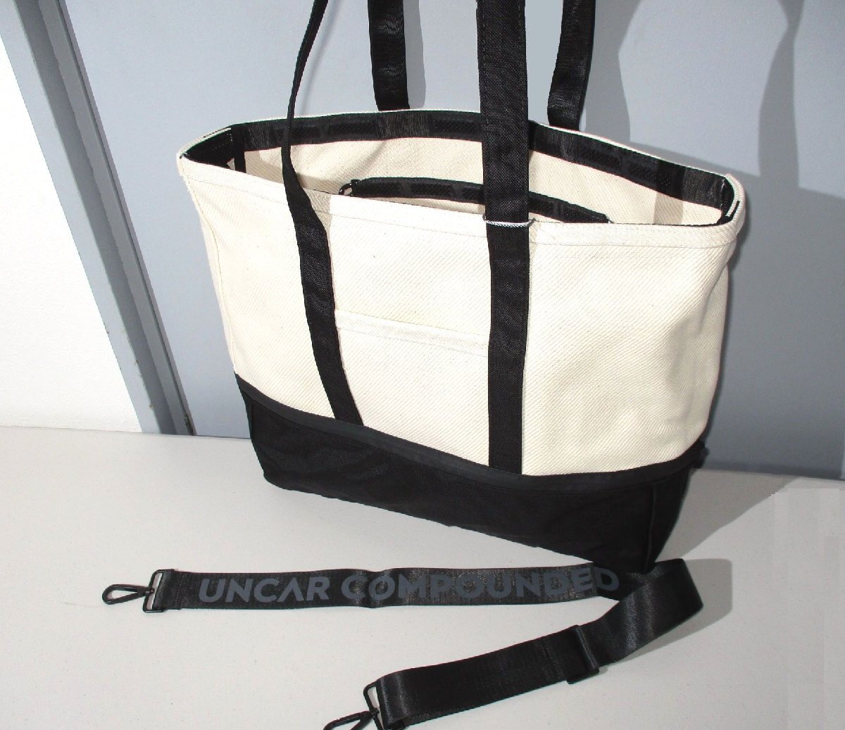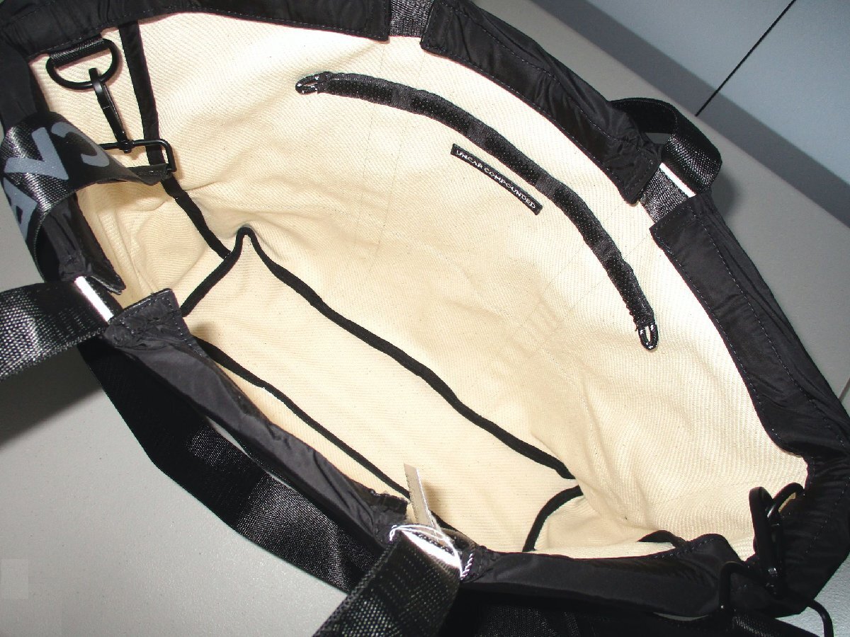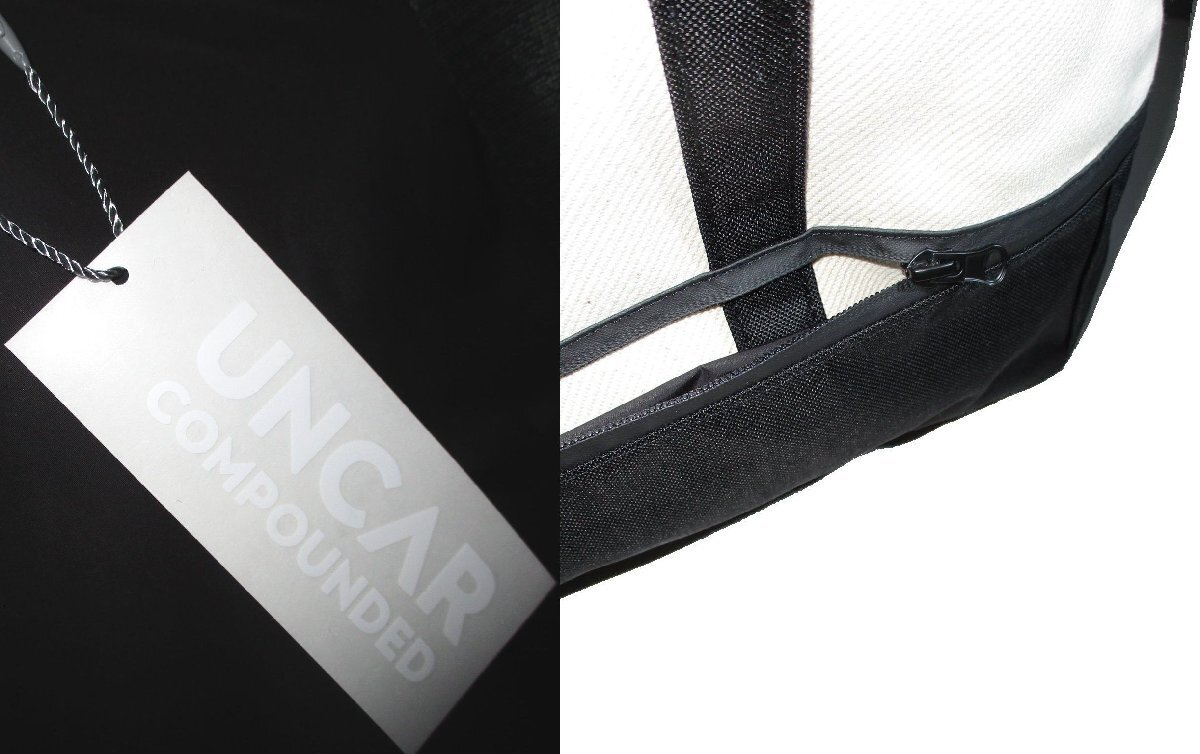 ビームスのセレクトラインから発売された、UNCAR COMPOUNDED(アンカーコンパウンデッド)の2wayトートバッグです。 (紡績~製織~加工など全ての工程を国内生産された)非常に質感が良く高密度で丈夫感があり、立体感のあるツイル綾織り目がとても美しい綿帆布を採用。バッグ下部の黒い部分(写真9枚目参照)の中に黒のカバーが内蔵されており(ファスナーを開けて)、カバーを引っ張り出して全体を覆い、マジックテープで止めると写真1・2・3枚目のように、一気に秋冬の装いになります。雨風に強くお手入れも簡単。カバー使用時は秋冬物、未使用時は春夏物としてオールシーズン使える便利なトート。丈夫で耐久性が高く非常に扱いやすい、末永くご使用いただける逸品です。