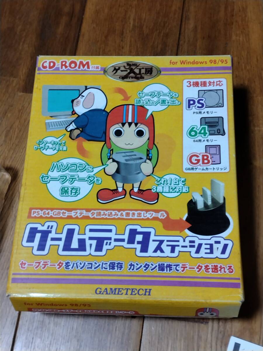 こちらは、GAMETECH(ゲームテック)社が販売していた周辺機器、「ゲームデータステーション」本体一式です。PlayStation、ゲームボーイ、NINTENDO64のセーブデータ管理に使用する機器です。
