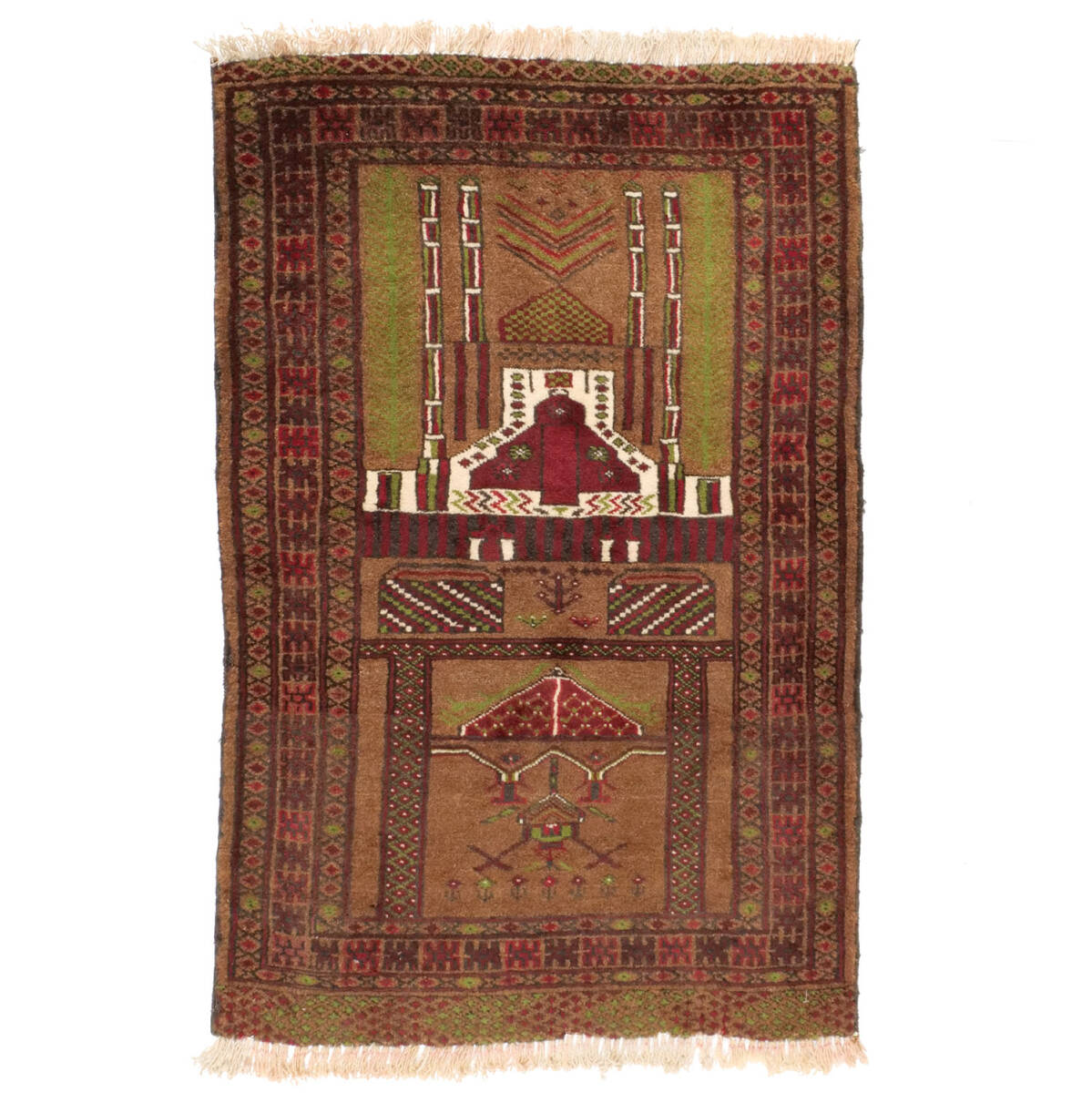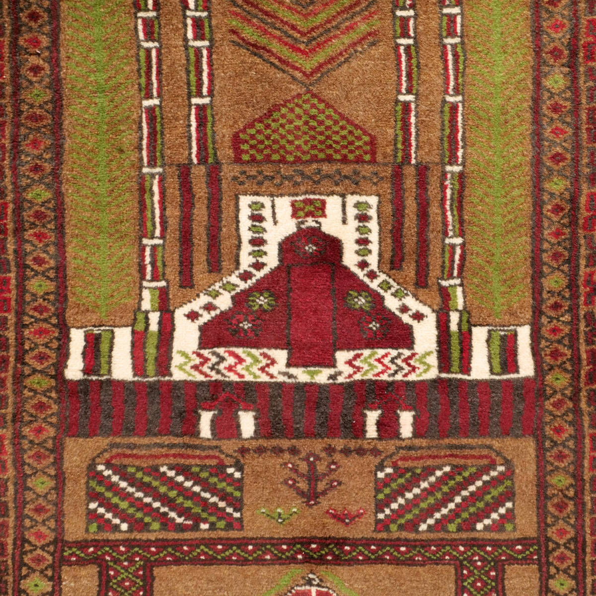 1950年代に制作されたトルクメン産のセミアンティークラグです。中央から上部にかけて配置された塔状のモチーフは、ミナレット文様として知られ、天へと伸びる象徴的な構図が特徴です。手織りによる緻密な織りと、長い年月を経て柔らかく落ち着いた色調が生まれています。