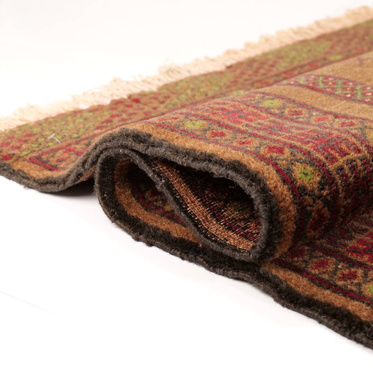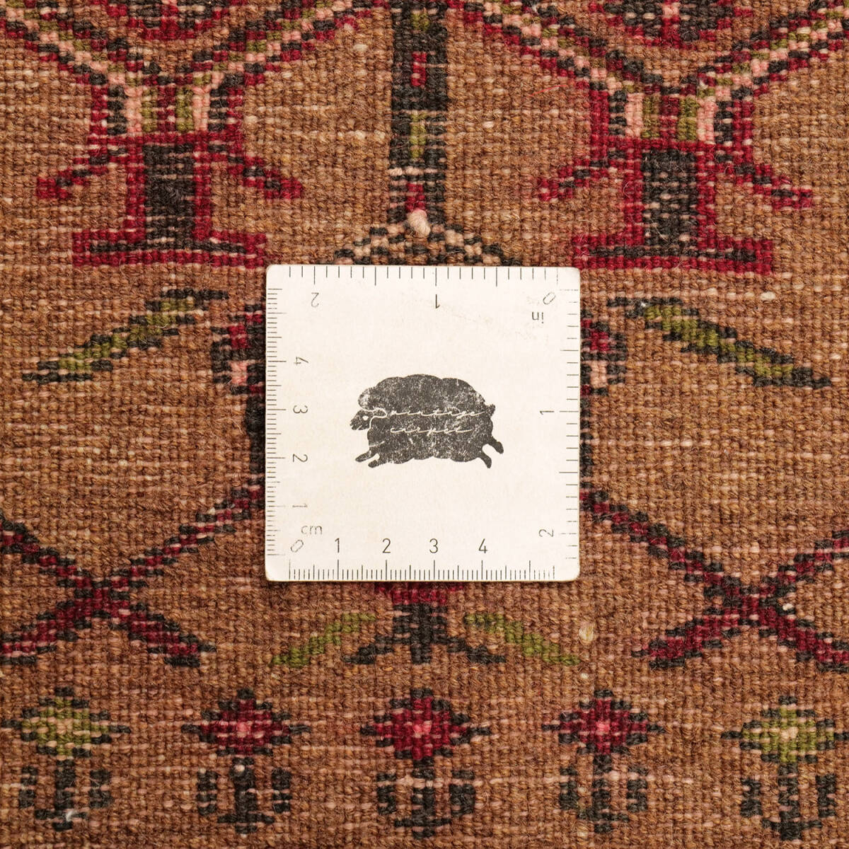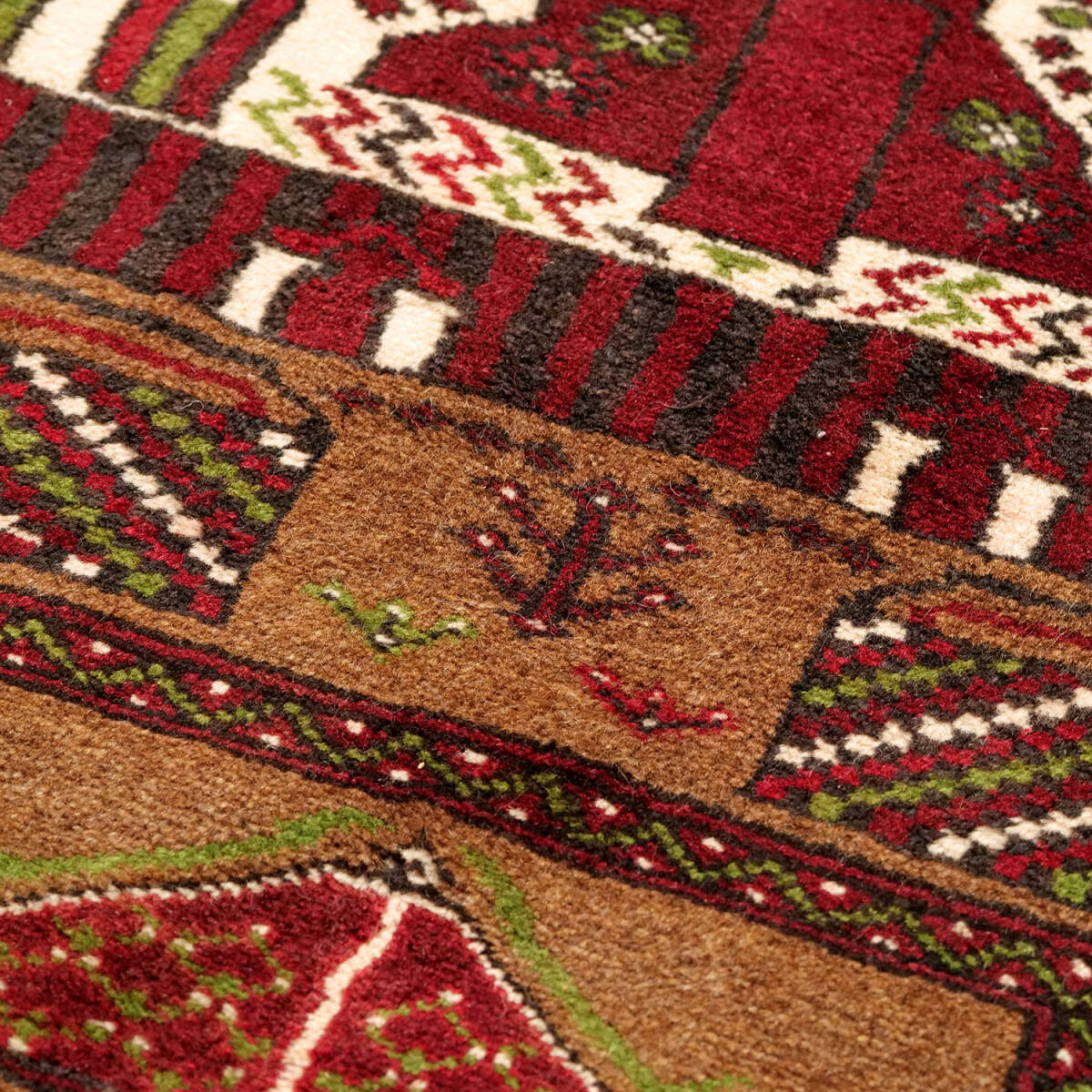 赤や茶を基調とした温かみのある色合いに、緑と生成りが加わり、奥行きのある表情を見せます。下部には幾何学的な構成が見られ、トルクメン特有の秩序と対称性が美しく表現された一枚です。
