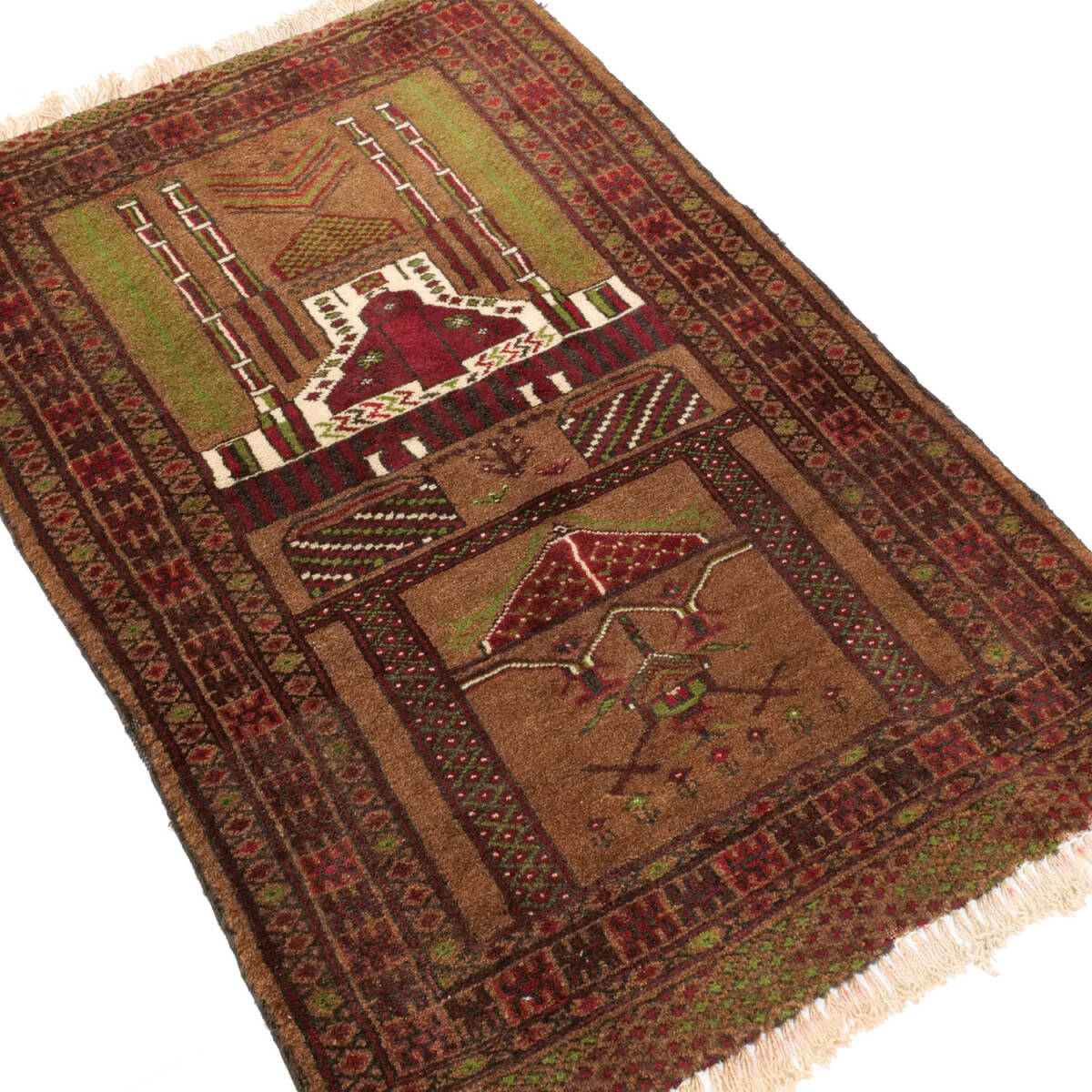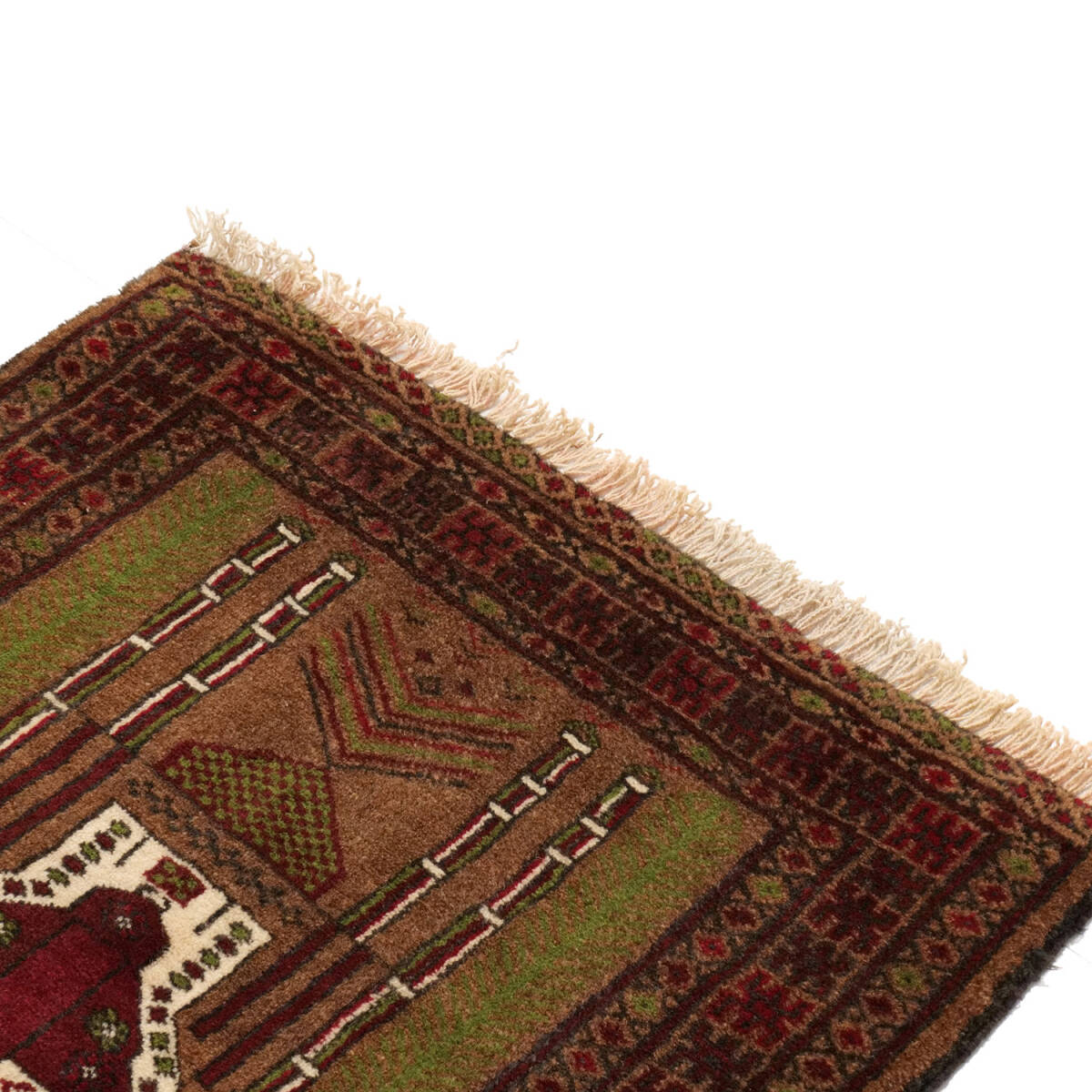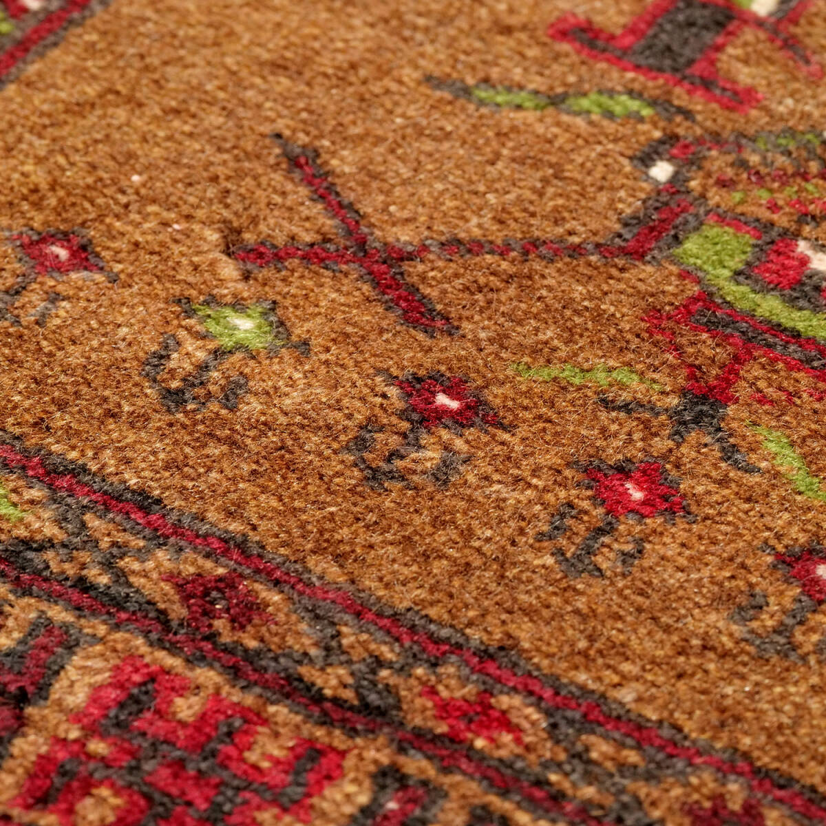 赤や茶を基調とした温かみのある色合いに、緑と生成りが加わり、奥行きのある表情を見せます。下部には幾何学的な構成が見られ、トルクメン特有の秩序と対称性が美しく表現された一枚です。