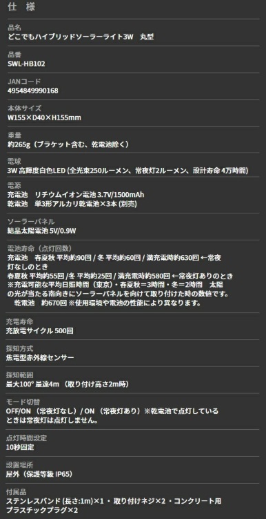 どこでもハイブリッドソーラーライト3W 丸型 SWL-HB102 ライテックス