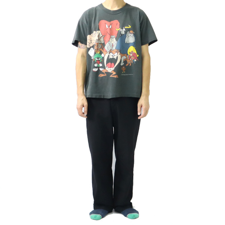 ルーニーテューンズのTシャツです。タグが無くなっていますが、1992年のコピーライト入りです。袖と裾はシングルステッチ、オールコットンボディーで、黒が色落ちしてグリーンやグレーがかった色味になっています。アメリカで見つけた一点物、宜しくお願い致します。