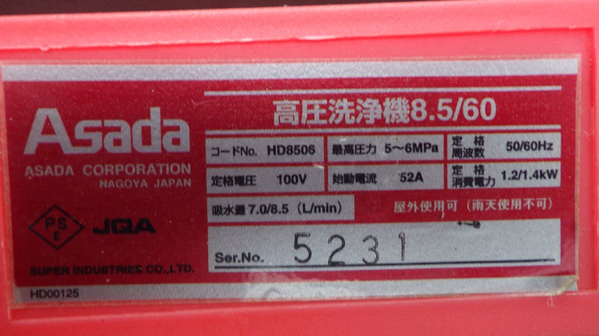 *【中古品】アサダ ASADA ハイプレッシャークリーナ 高圧洗浄機 8.5/60 100V 50/60Hz ドレンクリーナー 高圧 洗浄機 清掃 排管 掃除