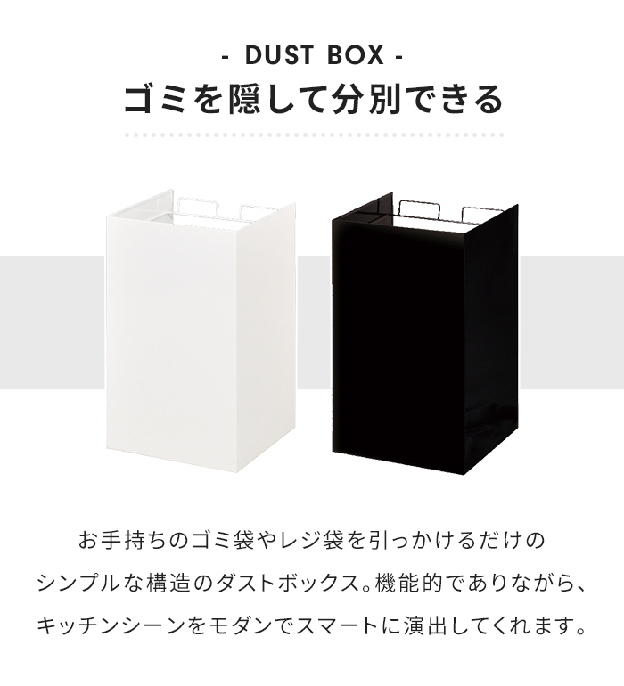 | レジ袋を引っ掛けるだけの簡単設置。 正面から袋が見えない目隠しパネルで見た目もスッキリとして、キッチンシーンをモダンでスマートに演出してくれます。 目隠しパネルはマグネット式なので、ゴミ回収カレンダーやメモ帳を貼るのに便利。 フタがなく開閉が不要なので、高さ制限のあるカウンター下やパントリーなどでも使えます。 隠しキャスターで掃除の際の移動もらくらく。見た目はもちろん、使い心地を重視し、デザインしました。 安心の日本製。 |