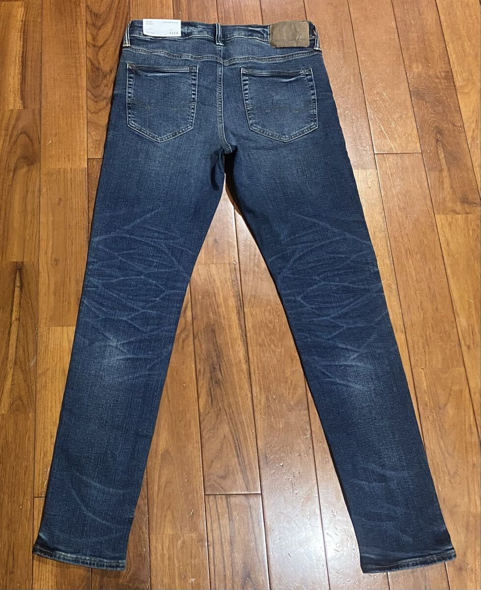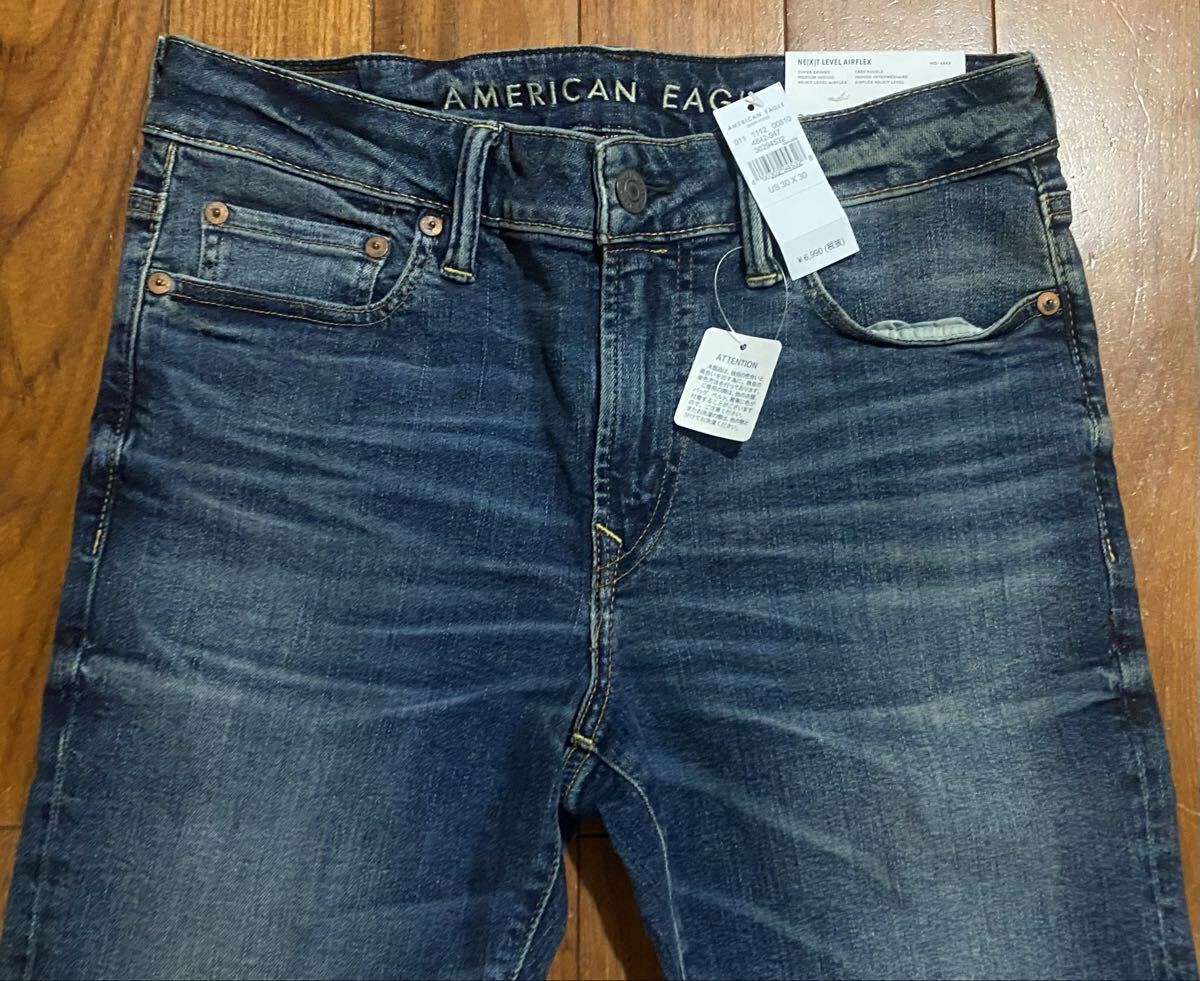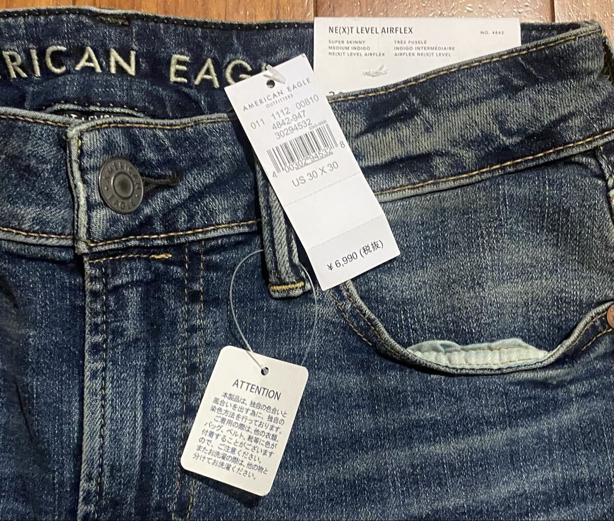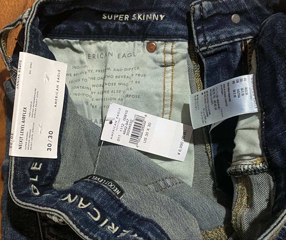 アメリカンイーグルのストレッチスキニーデニム(ジーンズ)、NE(X)T LEVEL AIRFLEX SUPER SKINNYです。色はインディゴブルーです。未使用です(定価¥6,990(税抜))。生地はストレッチ入りでコットン99%、ポリウレタン1%です。紙パッチ、ジッパーフライ、裾はチェーンステッチです。正規品です((株)イーグルリテイリング、ベトナム製)。サイズはW30×L30でウエストは重ねずに平置きで約77cm、ヒップ約92cm、股上約25cm、股下約76cm、股下15cmのふともも部分約46cm、裾まわり約29cm、重量約530gです。発送はゆうパケットポストになります。