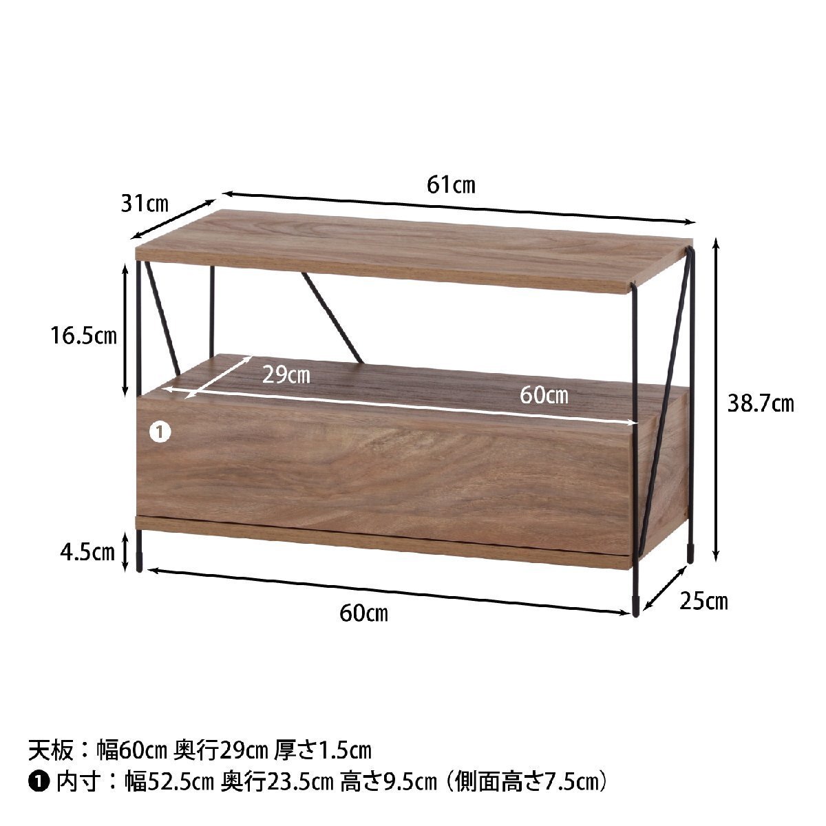 | サイズ | 全体:幅610 × 奥行310 × 高さ387mm 耐荷重(棚板1枚):10kg 棚板厚:15mm 引出内寸:520x235x95mm ※詳細はサイズ画像をご確認ください。 |
