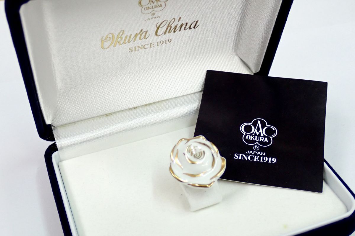 ▲美品 OKURA 大倉陶園 ホワイトローズ 陶器製 ピンブローチ(直径約2cm)▲箱付/ピンバッジ/バラ/消費税0円