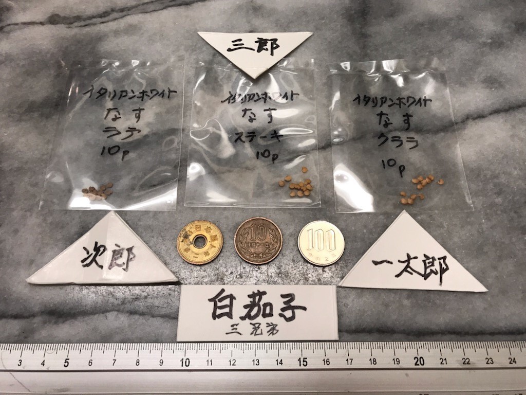 白茄子三兄弟  イタリアンホワイトなす3種 晩生クララ&中晩生ラテ&中生ステーキ たね 各10粒 /1セット¥200スタート