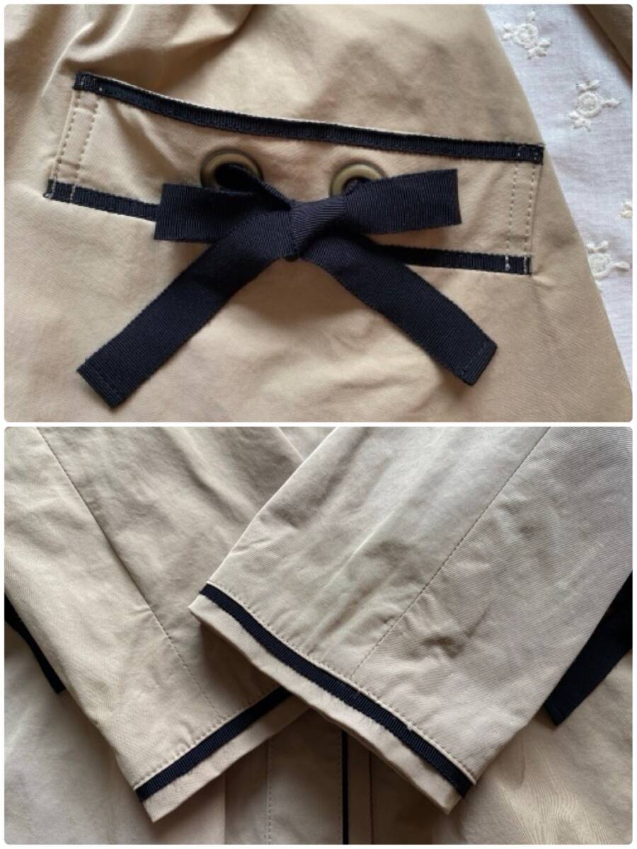フラットギャザー襟、ポケットグログランリボン使いもフェミニンです。