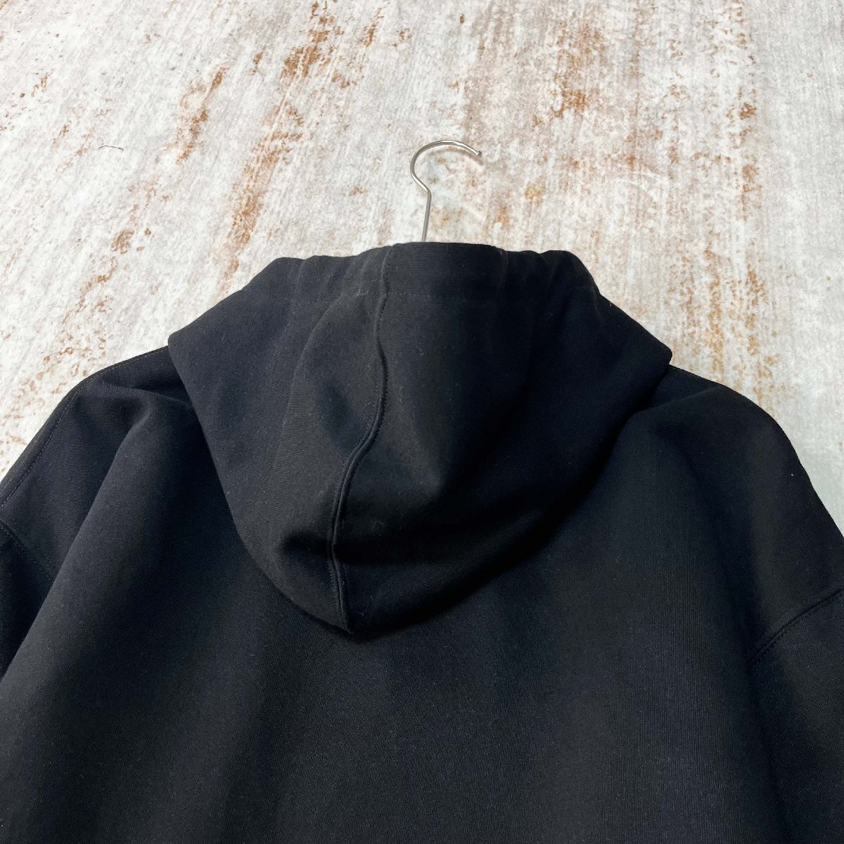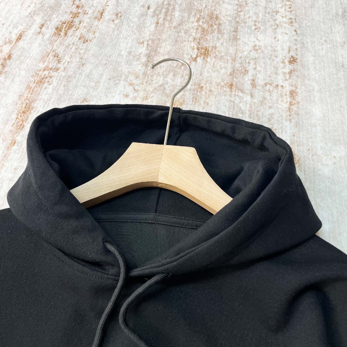 フードには調節可能な紐が付いており、風の強い日も安心。袖口はしっかりとしたリブ仕様で冷気の侵入を防ぎ、左胸前にはシンプルながら存在感のあるミニマルなプリントがアクセントに。大容量のカンガルーポケットは両手を暖めたり、小物を収納したりと便利なデザインです。