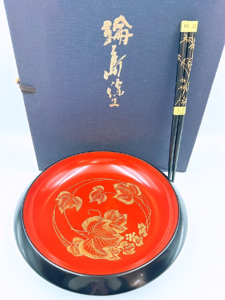 1円【未使用】輪島塗 沈金 木製菓子鉢 箸付き 箱付 日本伝統工芸品 高級漆器 現状保管品【KO044】