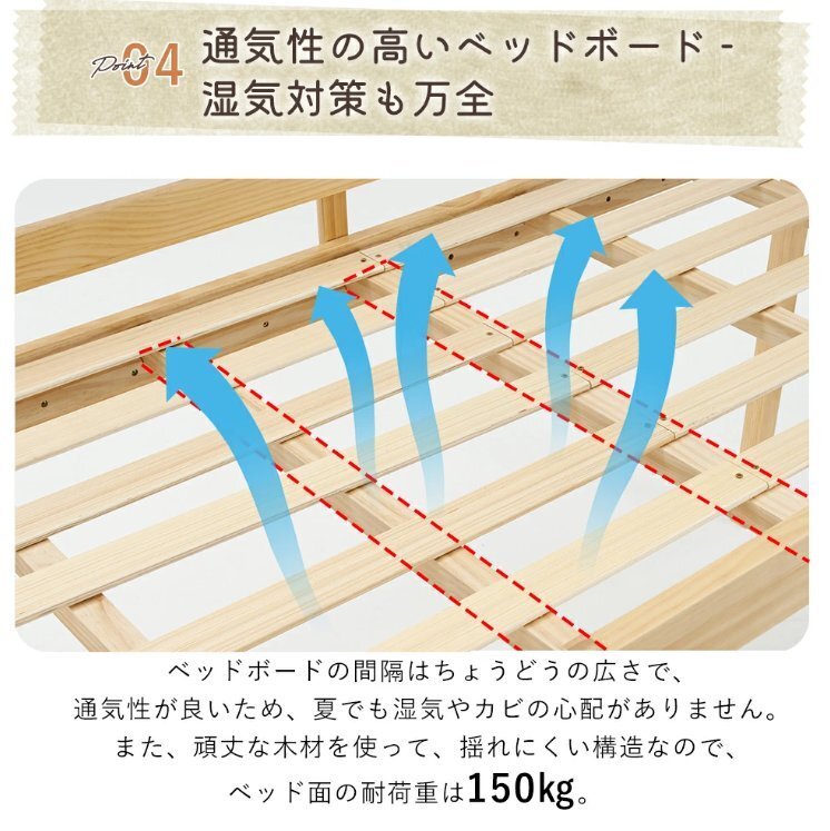 • 【通気性の高いベッドボード - 湿気対策も万全】ベッドボードの間隔はちょうどうの広さで、通気性が良いため、夏でも湿気やカビの心配がありません。 また、頑丈な木材を使って、揺れにくい構造なので、ベッド面の耐荷重は120㎏。