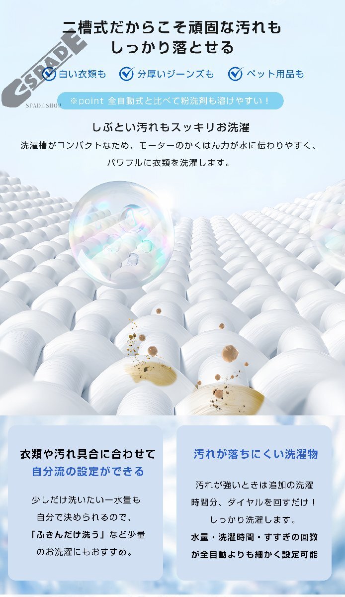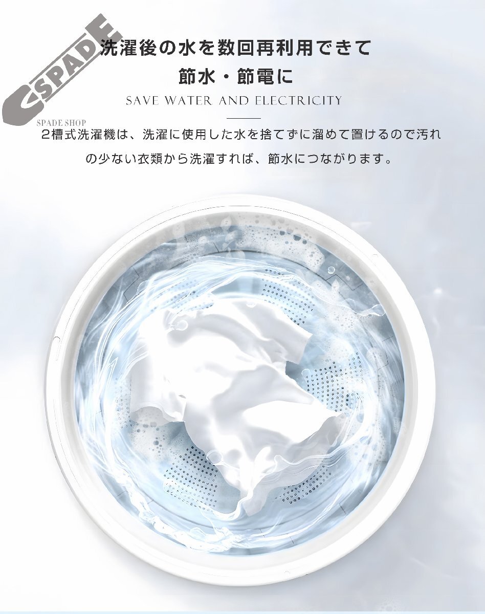 • 【同時に洗濯と脱水が可能で、時間を短縮!】洗濯と脱水が同時に運行できる2槽式の洗濯機では、色落ち衣類、下着、ベビー服、介護用品、ペット用品など、いろいろな分け洗いのニーズがある衣類の洗濯時間を大幅に節約することができます。