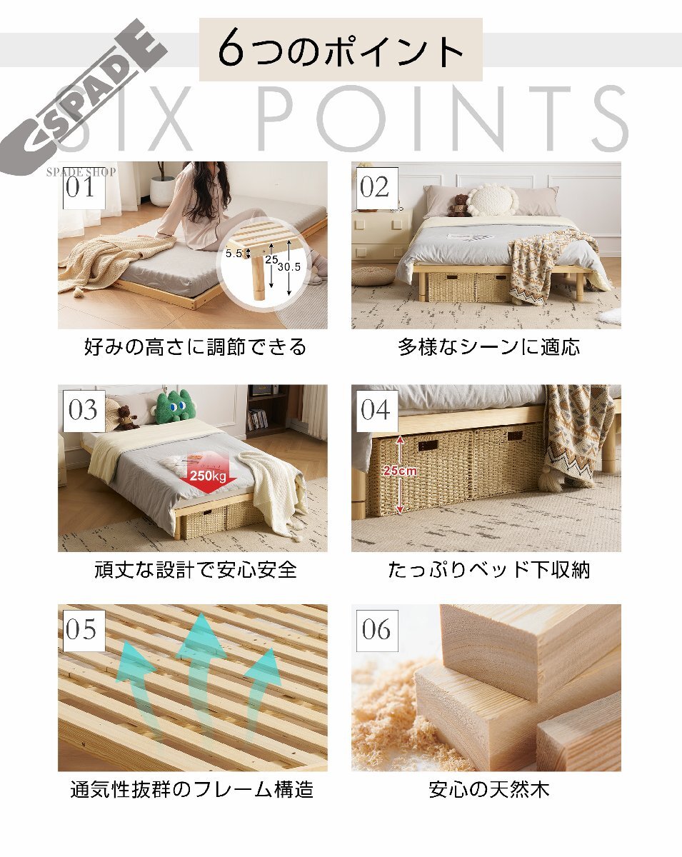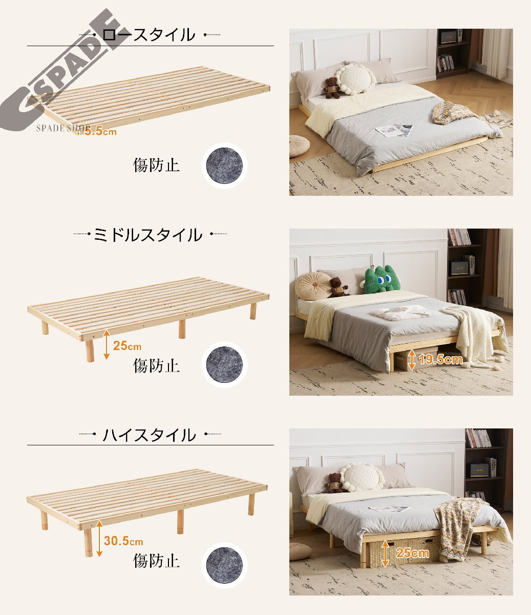 • 【好みの高さに調節できる 】独自の3段調整デザインで、ベッドの脚の高さを調節することで、3種類の高さ設定が可能です。