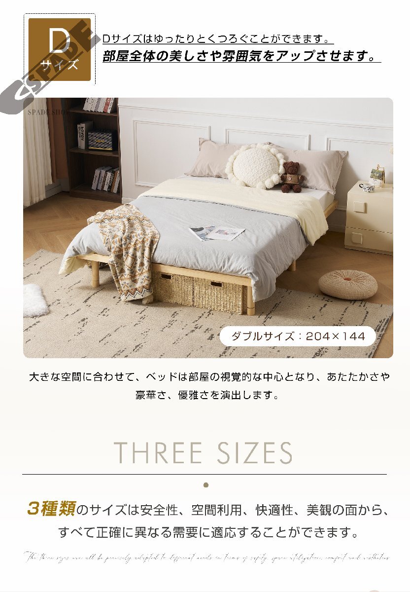 • 【多様なシーンに適応】サイズもお好みでお選びいただけます木製のベッドは三種類の実用的なサイズに設計されていて、広い部屋にも狭い部屋にもぴったりとフィットし、快適な睡眠空間を作ることができます。