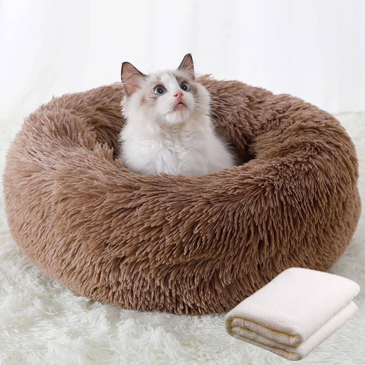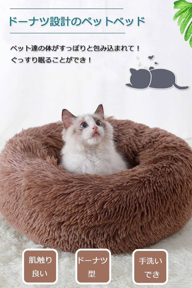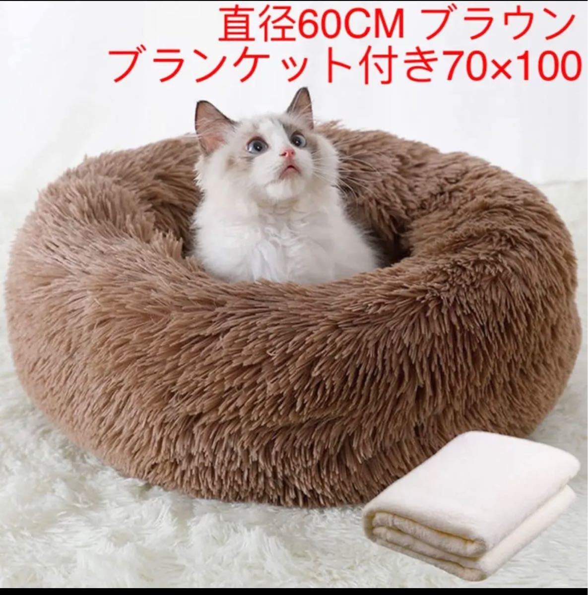 ペットベッド 猫・犬用ベッド ブランケット付き 猫ベッド 犬ベッド 丸型 ふわふわ もこもこ 滑り止め 防寒 寒さ対策 ペットクッション 猫用 小中型犬用 小動物用 通年用 洗える 直径60CM ブラウン