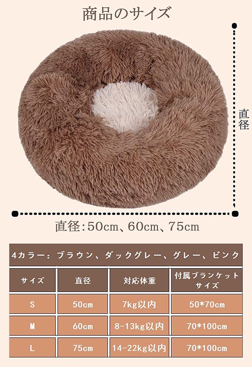 ペットベッド仕様】:カラー:ブラウン;丸型ベッド直径:60cm、対応ペット体重:8-13kg以内;商品本体重量:約820g、付きの毛布サイズ:70*100cm;ペットベッドの表面は約4cmのシャギー製長毛素材となり、ぽかぽかで肌ざわりよくてあったかいです。底部と側面に綿が程よく詰まっているので気持ちよくリラックスして休めます。優質なPPコットンが周囲と底にあり、快適で暖かく、弾力性が高く、クッション性も良い。