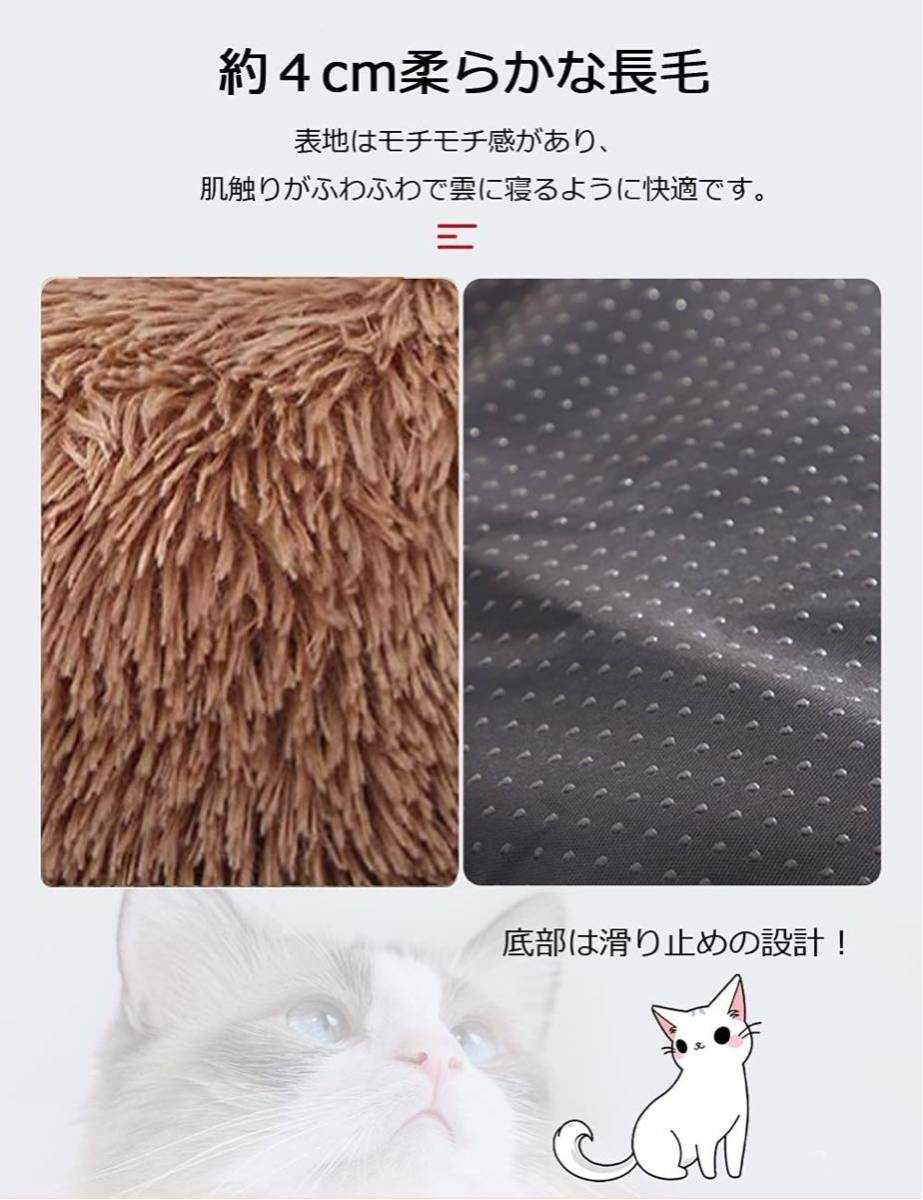 【丸型クッション設計】:ドーナツのような丸形に設計され、ペットの体を包み込むような暖かさを提供しており、寒い冬にも熱量を失わなくなって、ペットの体温を維持することができます。ペットちゃんに曇のような快適な眠りを与えます。子猫や子犬もリラックスしてゆったり過ごせます。どんな寝相をしてもぐっすり寝られます丸いベッドは全体としてふわふわで柔らかく、柔らかいPP立体綿で満たされています。底は、周りが高く中央が低い、親密な黒の滑り止めマットデザインです。猫ちゃんやワンちゃんは完全に丸く包み込みでき、雲の中に包まれているような暖かくて可愛いです。