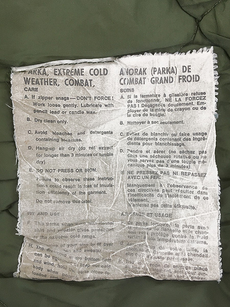 某ブランドのデザインソースに使われ話題となった、カナダ軍のモッズコートと呼ばれるECW(エクストラコールドウェザー) コンバットパーカー用の中綿入りライナー。