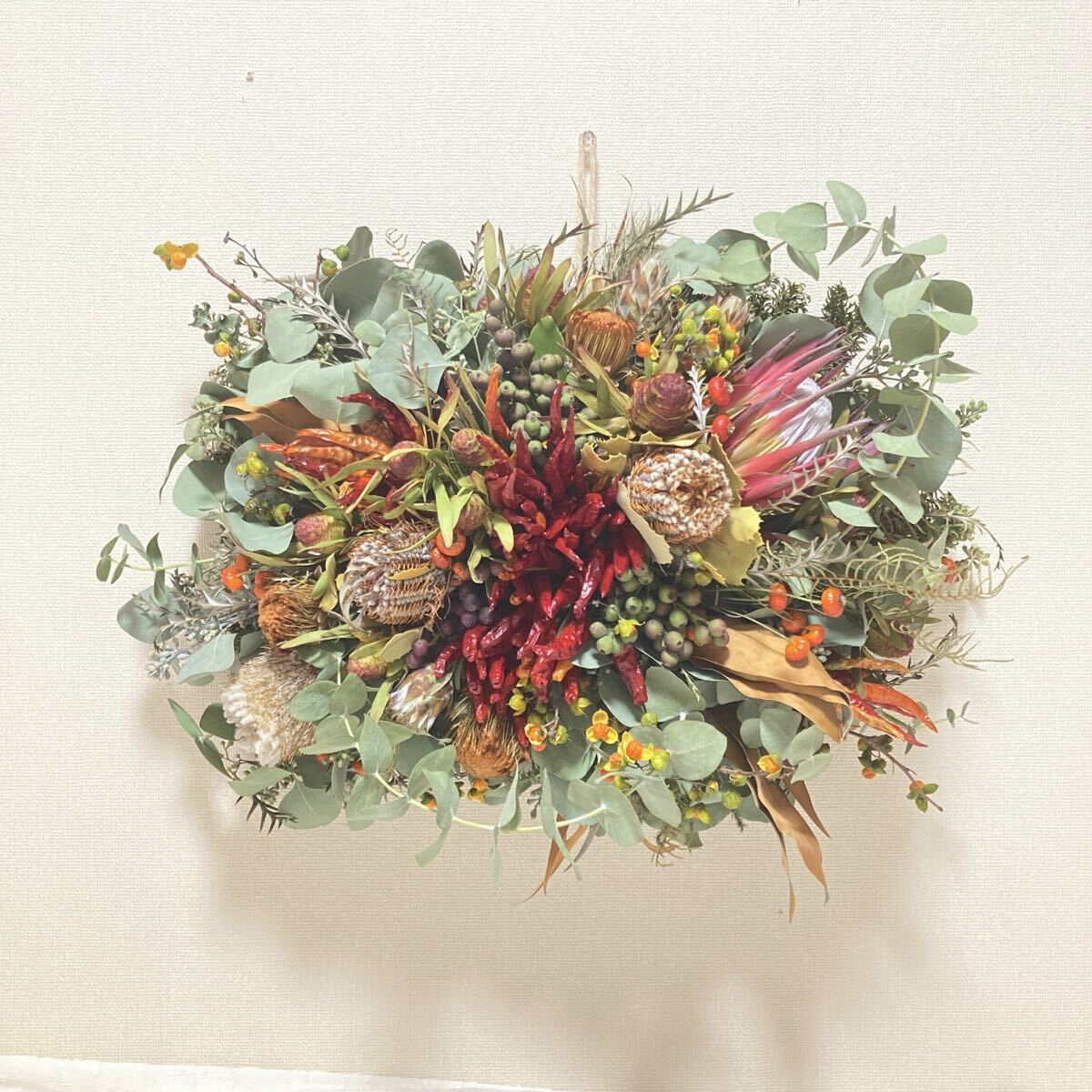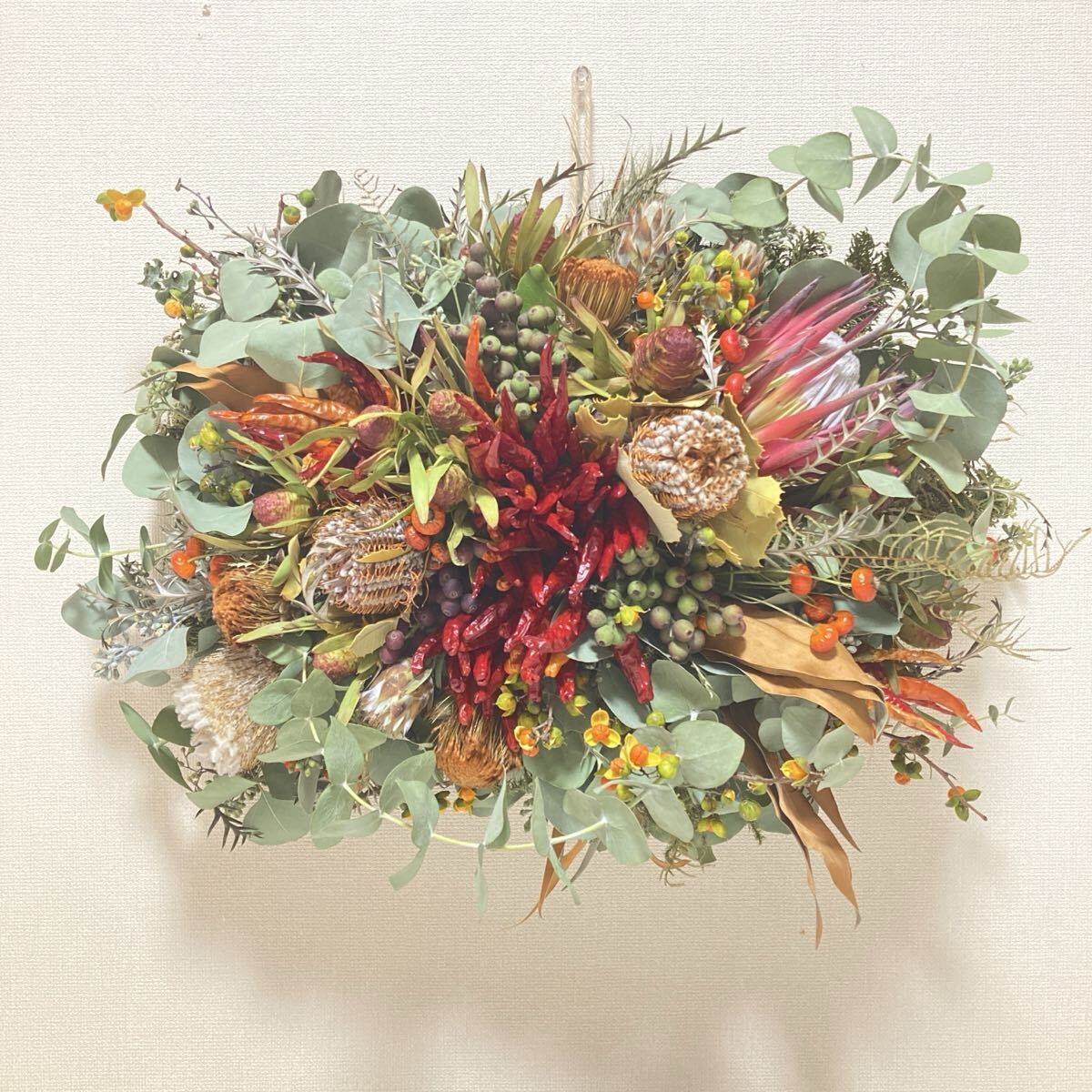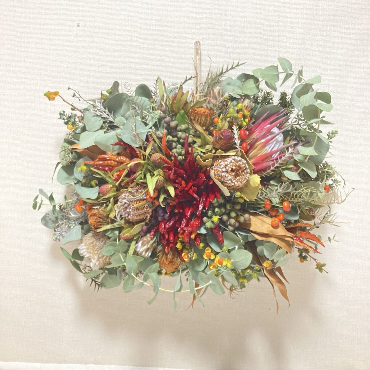 プロテアやバンクシアなど、旬なワイルドフラワーをメインにアレンジした創作リースです。
