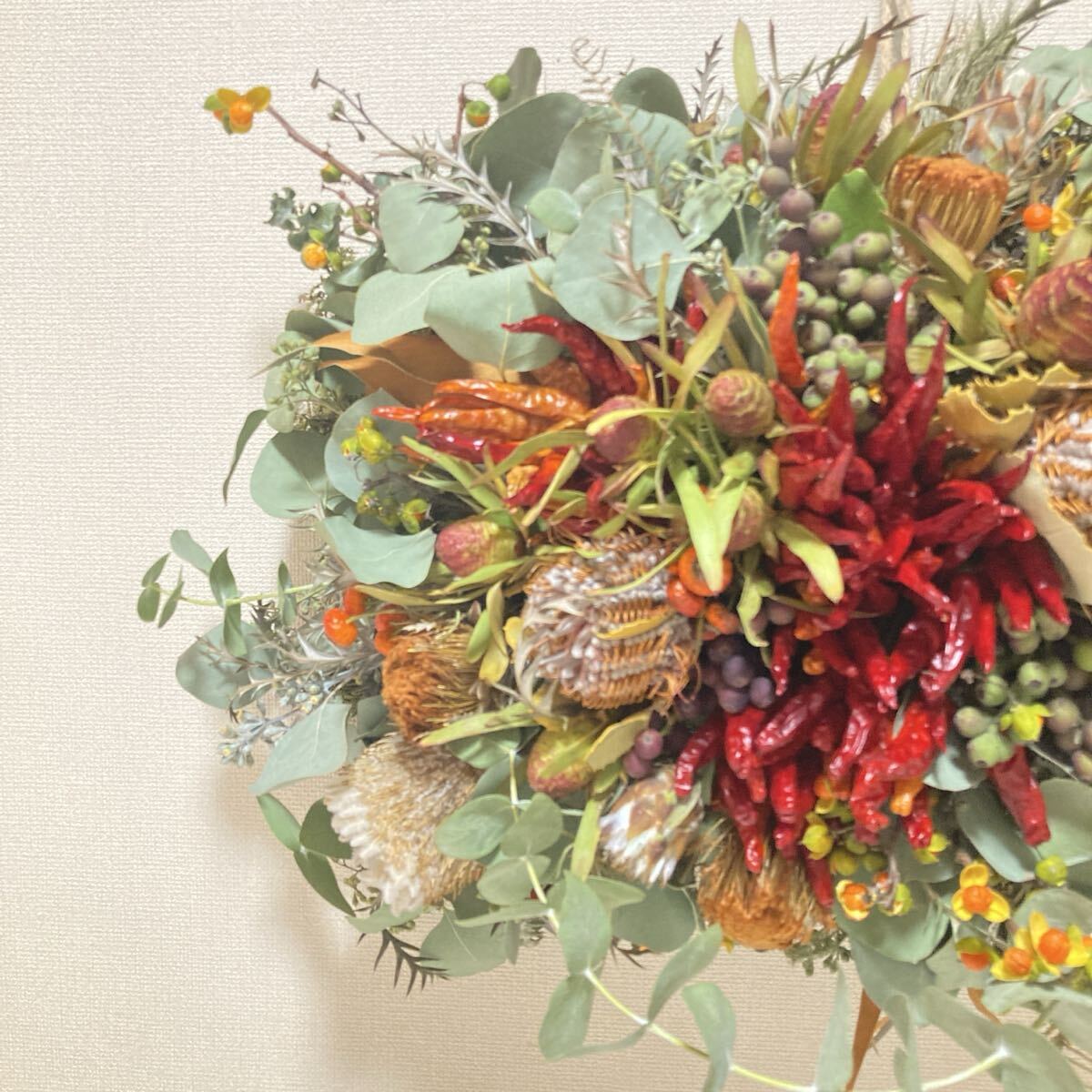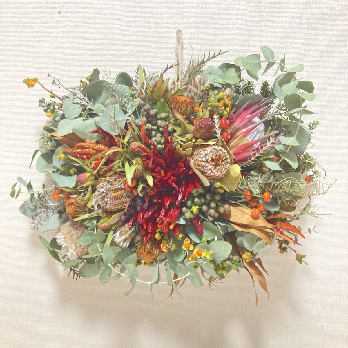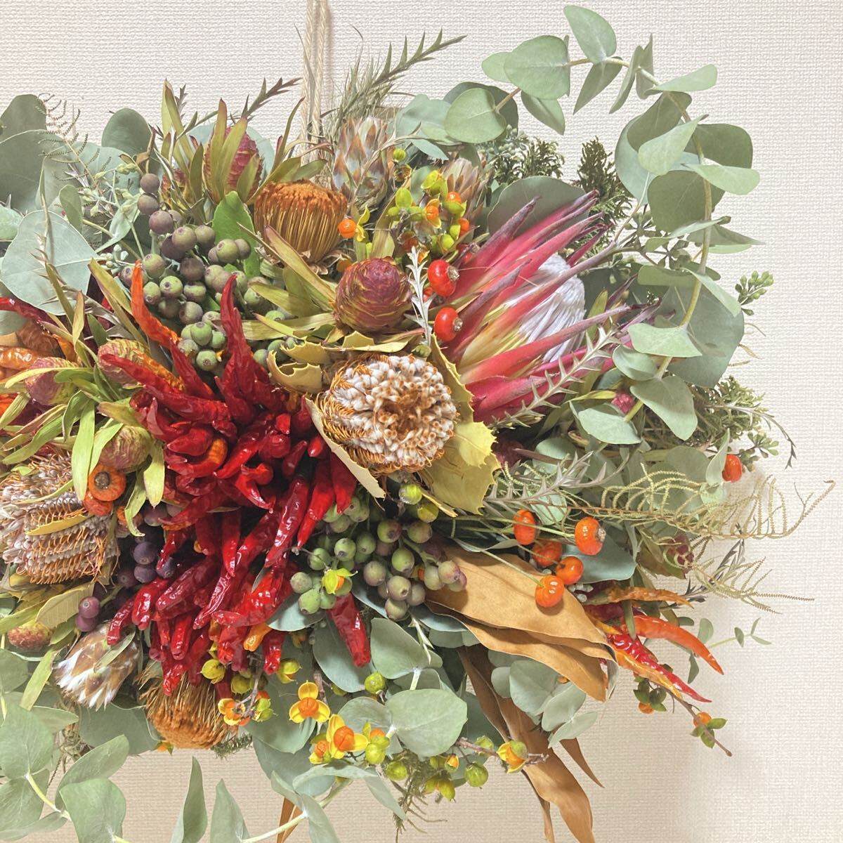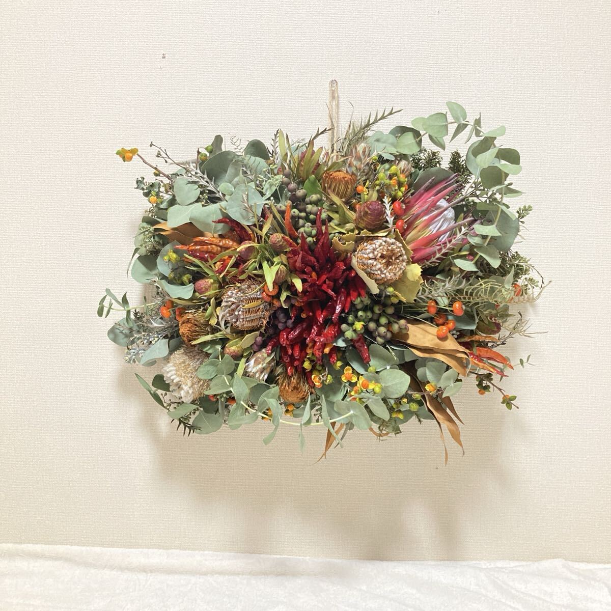 プロテアやバンクシアなど、旬なワイルドフラワーをメインにアレンジした創作リースです。