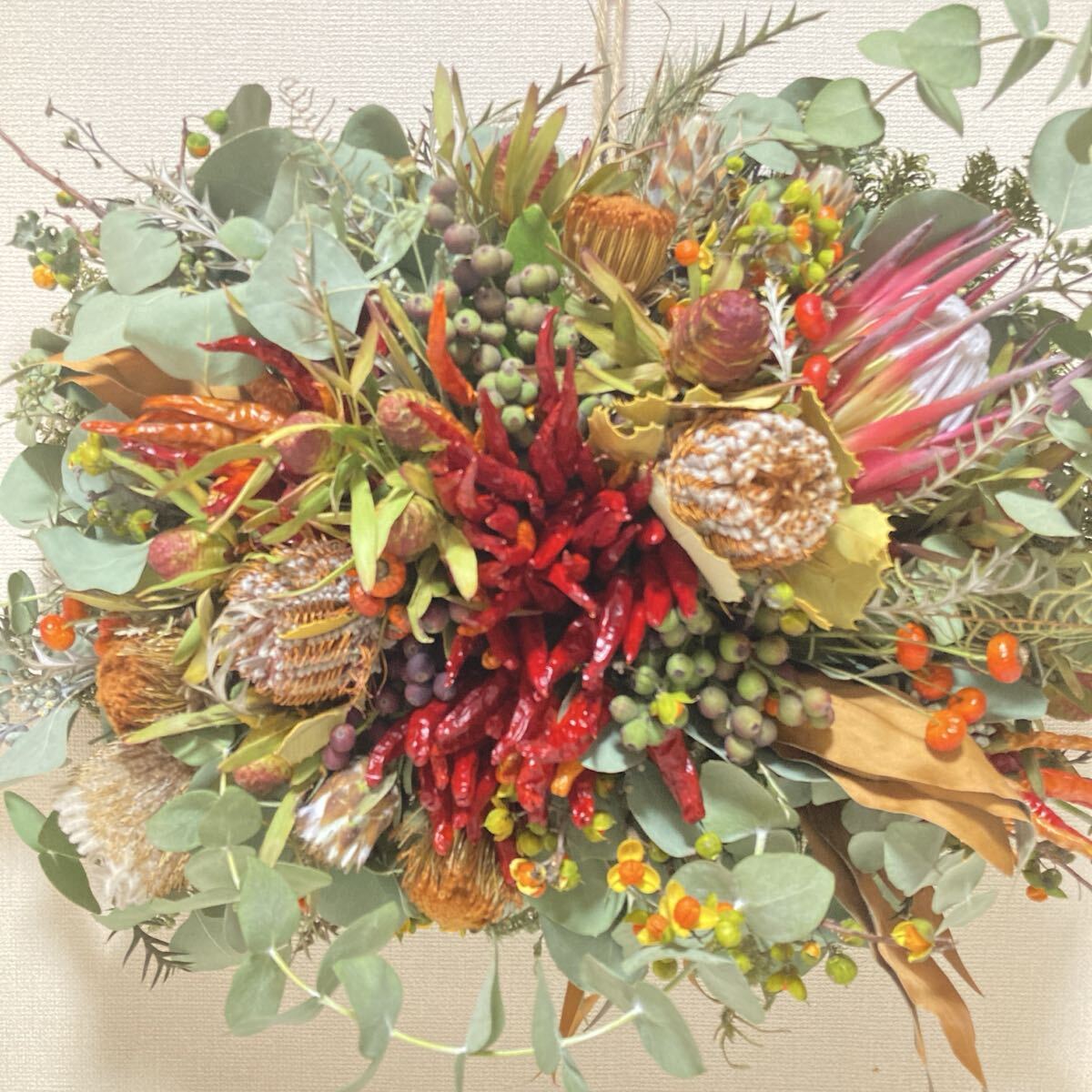 プロテア、バンクシア、ドライアンドラ、プルモーナ、野バラの実、トウガラシ、ツルウメモドキ、ポポラスベリー、グレビレアゴールド、グレビレアアイバーホー、コアラファン、シースター