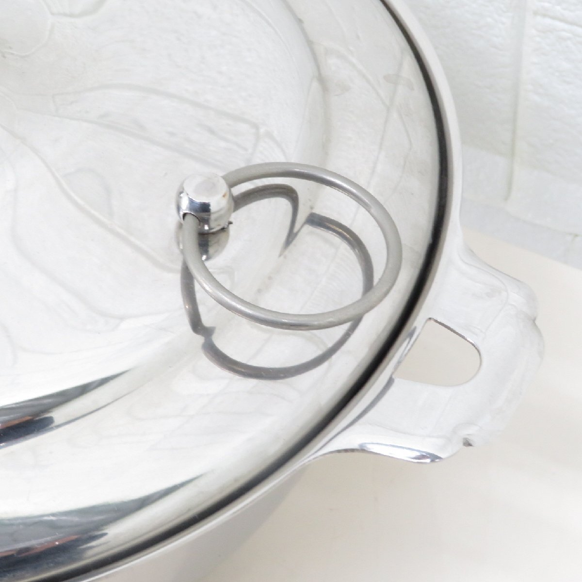 しゃぶしゃぶ鍋が入荷致しました。お色味はシルバーです。 しゃぶしゃぶは、冷たい肉や野菜をスープにくぐらせる度に温度が低下します。 そのため煙突を付けることで鍋と火が触れる面積が大きくし、スープを冷めにくくしているという特徴があります。 普通の鍋は、熱が外側に逃げていくので、具材をしゃぶしゃぶをするとき手が熱くなります。 しゃぶしゃぶ鍋は、真ん中に煙突があることで煙突から熱を逃すので、手が熱くなることを防ぐ役割があります。 中古品ですが汚れが少なく、比較的綺麗な状態です。 |
