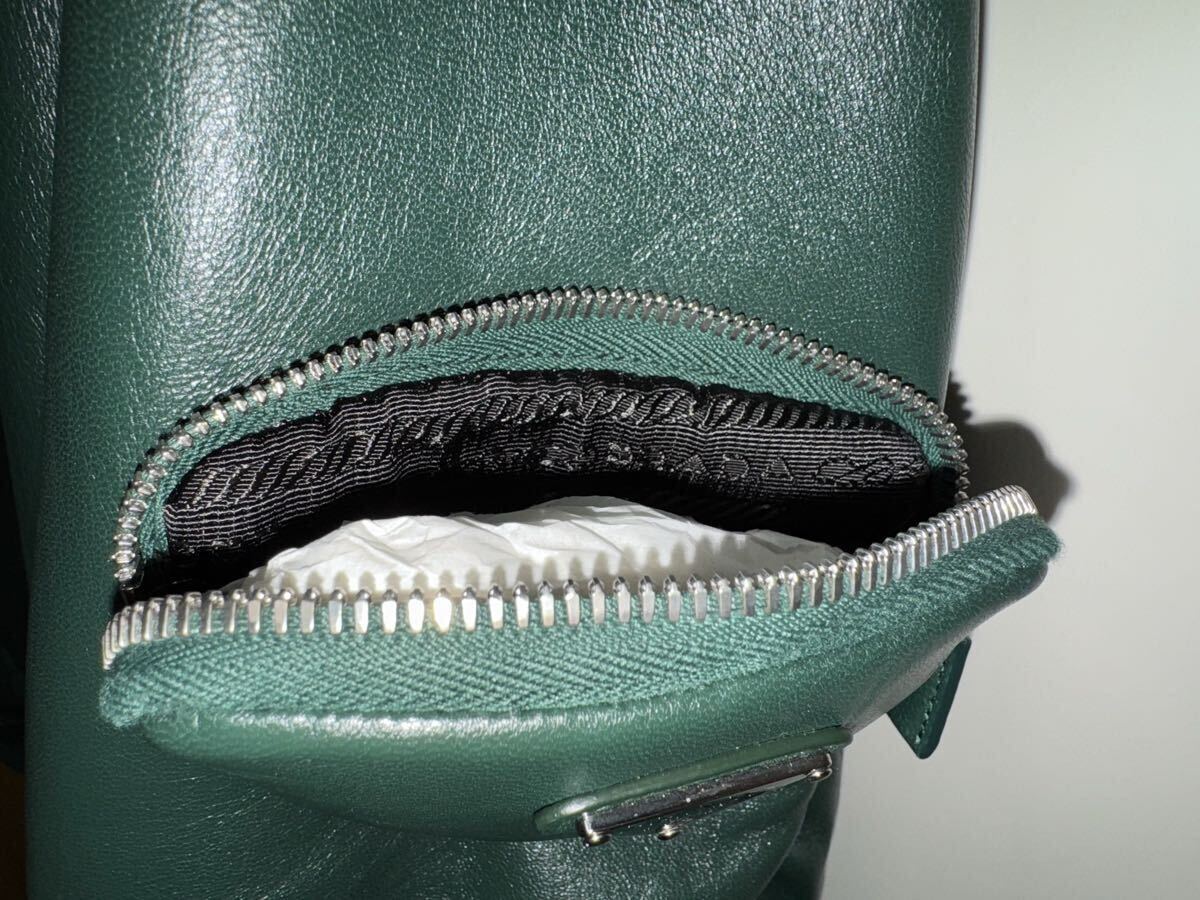 異なる要素の組み合わせがスタイル、カラー、素材の美しいコントラストの中で相互に作用しあうコレクション。包み込むようなオーバーサイズデザインでストリートウェアのボリュームを際立てた、柔らかなナッパレザー(羊革)ボンバージャケット。手作業でヴィンテージ加工を施して光沢を出し、鮮やかで深みのある多彩なカラーに仕上げています。アイコニックなプラダのトライアングルのコンセプトを再解釈し、機能性を備えたディテールにアレンジ。ポーチを袖にあしらい、エナメルメタルのトライアングルロゴを飾りました。