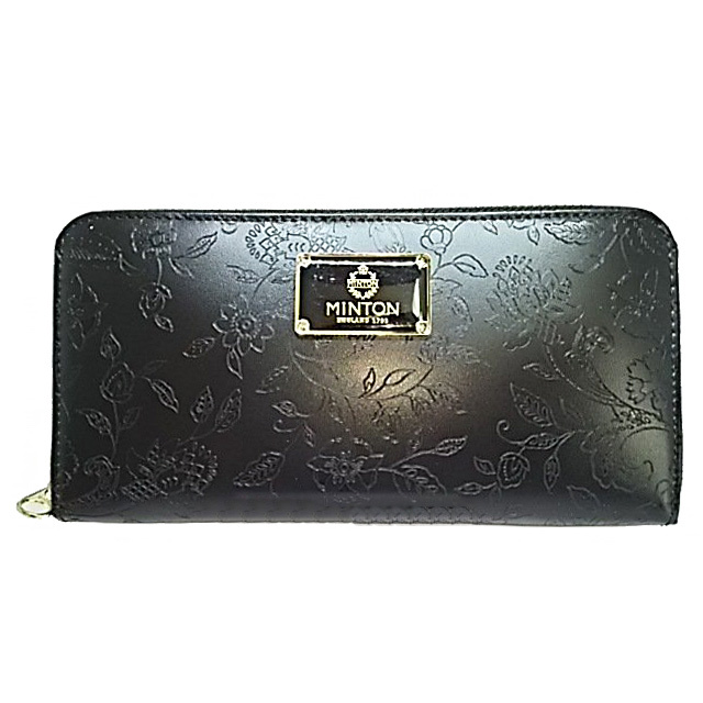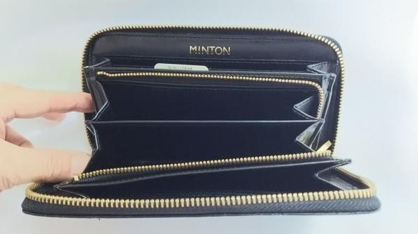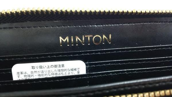 本革 ミントンのラウンドファスナー財布です。プレートに小さなキズやくすみがありますが、ほとんど問題ない程度です。