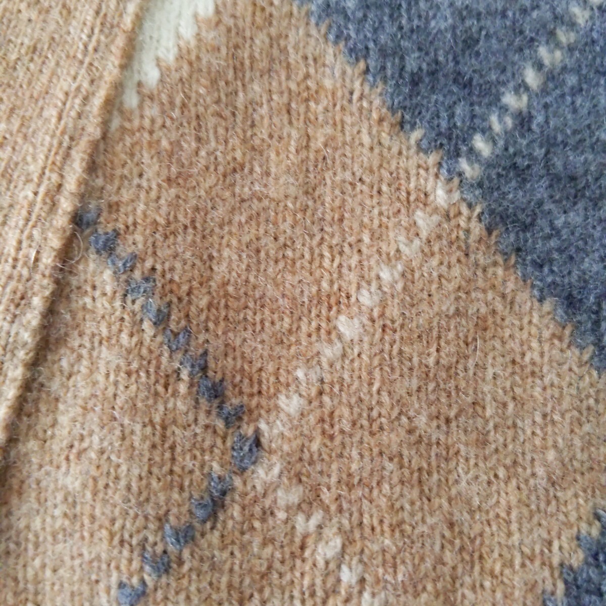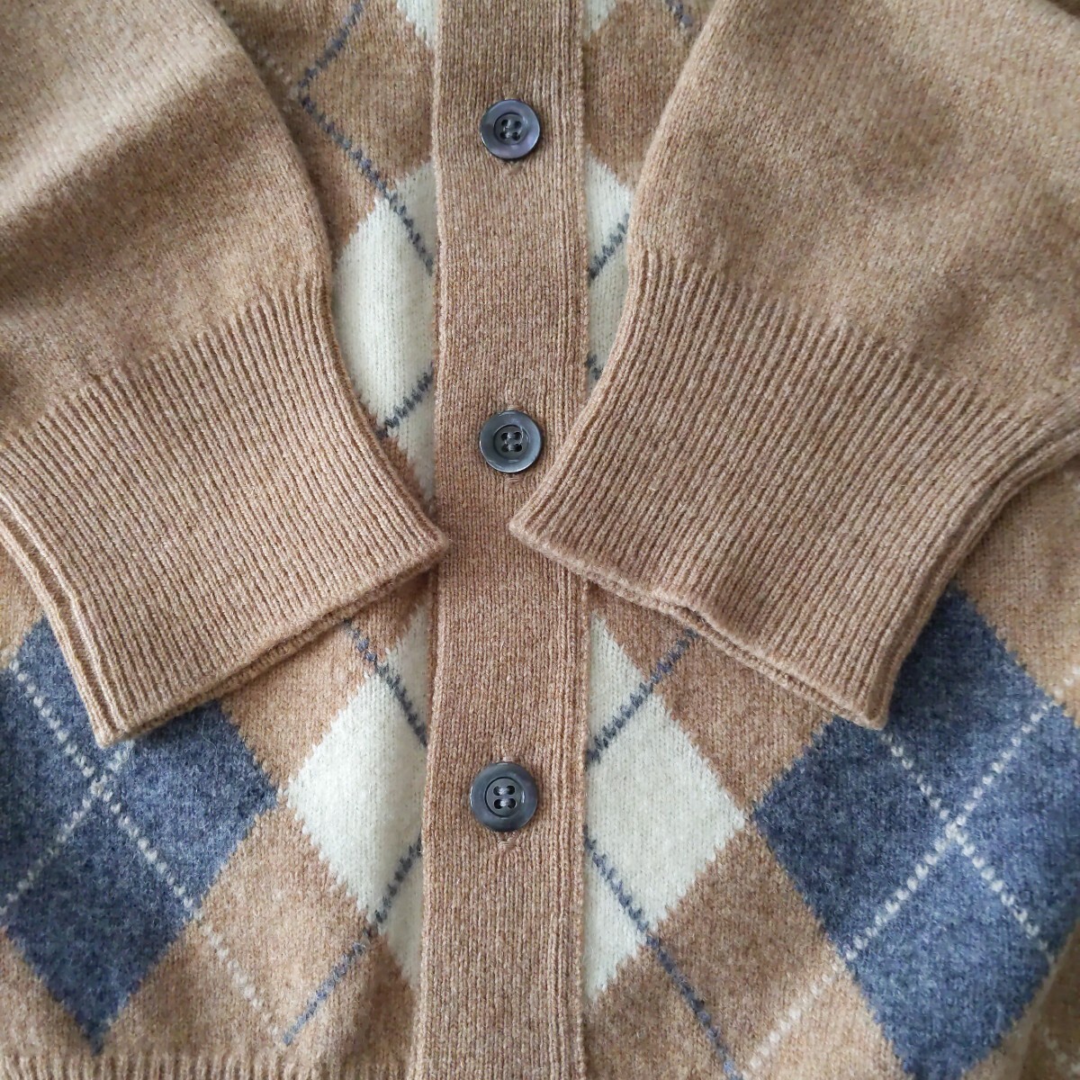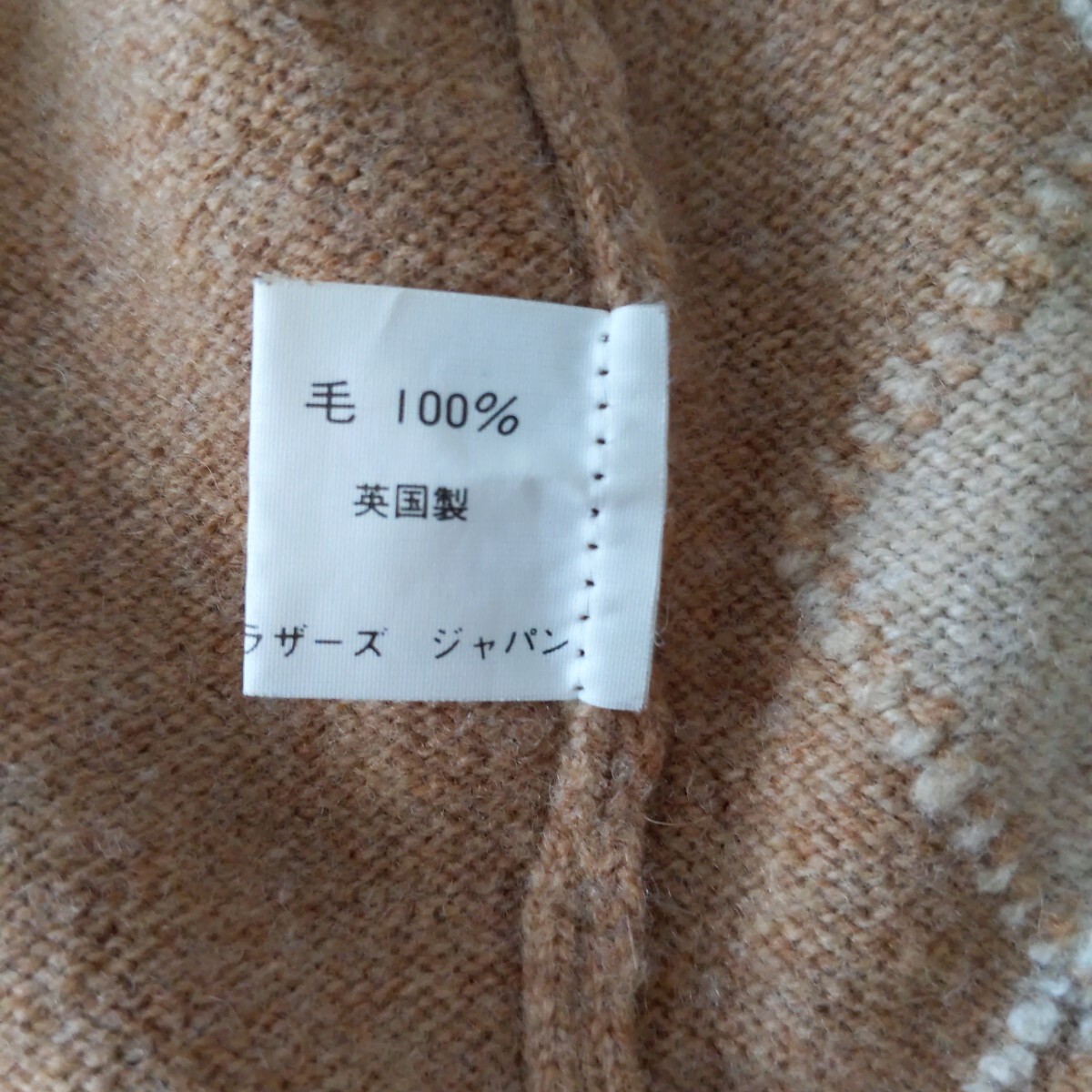 生地はウール100%。ベージュ系のアーガイル。ベースのベージュの色は六枚目の写真が近いと思います。