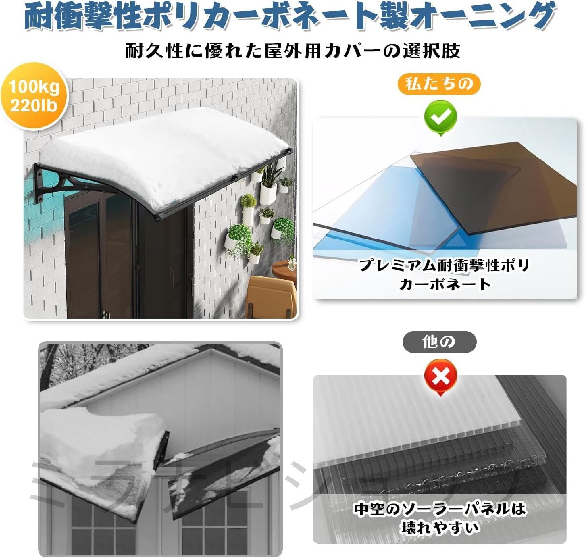 全天候型保護: この屋根は、雨、雪、強風、有害な紫外線から優れた保護を提供します。ドアや窓を風雨から守り、夏の暑さを軽減することで、家と家族を一年中快適かつ安全に守ります
