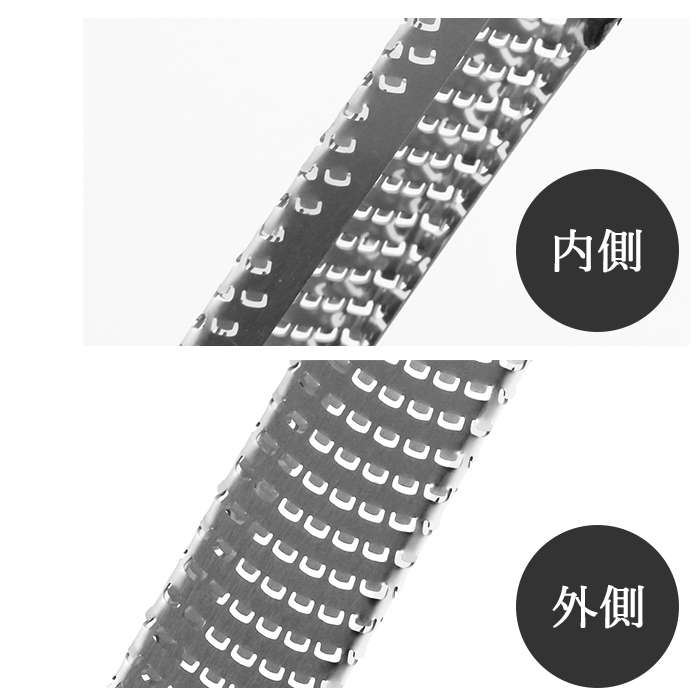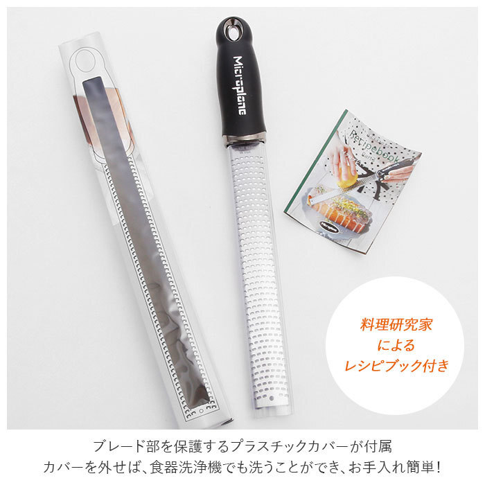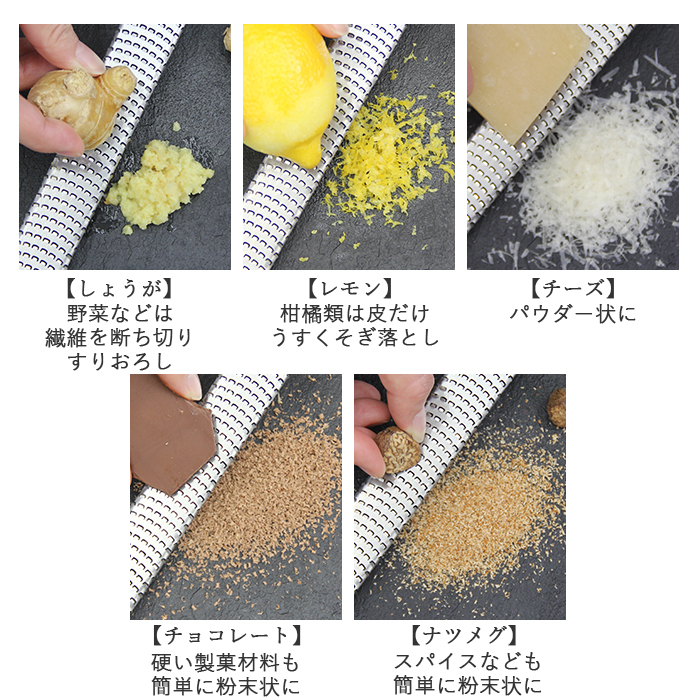 | 商品説明 | ・マイクロプレイン・ゼスターグレーターはスタイリッシュでとっても便利なおろし金。 ・生姜は繊維を断ち切って滑らかに仕上げることができ、玉ねぎはドレッシング用に細かくおろせる! ・パルメザンチーズをイタリアン用にパウダー状にしたり、柑橘類は皮の表面だけを薄く削ぎおろして、お菓子作り用に活用したりと使い方いろいろ。 ・13クロムステンレス鋼製のブレード(刃)はアメリカで特殊取得の独自加工が施され、類似品にはない切れ味を実現。 ・「microplane」のロゴが入ったエラストマー樹脂製ハンドルのグリップは、持ちやすくおろし作業がとっても楽にできる。 ・アーモンドやナツメグ、チョコレートなどの硬いものも力を入れずに簡単に粉末状におろすことが可能。 ・ブレード部を保護するプラスチックカバーが付属。カバーを外せば、食器洗浄機でも洗うことができ、お手入れ簡単! ・キノコとチーズのリゾット、ウィークエンドシトロンなど、すぐにレパートリーに加えられる料理研究家によるレシピブック付き。 |