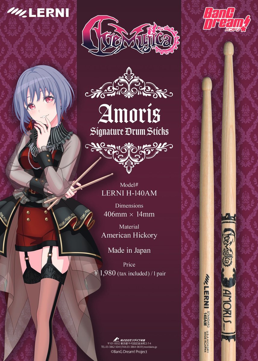 | LERNI「Ave Mujica“Amoris”シグネチャードラムスティック」 10周年を迎え更に進化中のバンドリ!から話題の劇中バンド「Ave Mujica(アベムジカ)」よりドラム”AMORIS”(アモーリス)のシグネチャードラムスティックが発売! ・サイズ:406mm x 14mm ・材質:アメリカンヒッコリー |