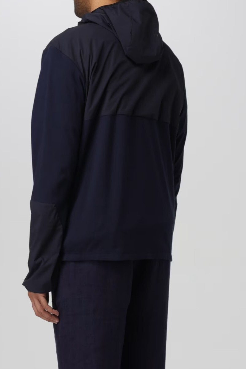 表ネイビー、裏ブルーとバイカラーとなったエクストラファインヴァージンウールのガーゼダブルジャージーに組み合わされたのは、やはりネイビーのストレッチナイロン。