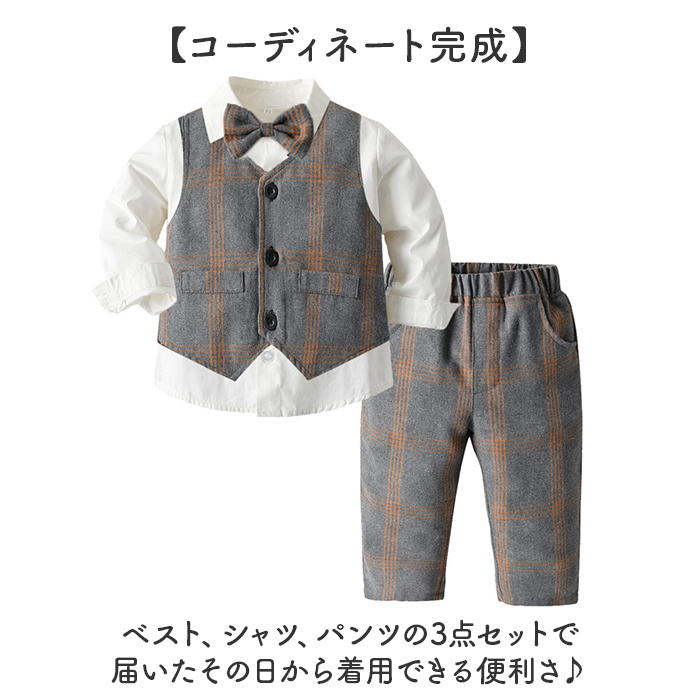 | 商品説明 | ・・【特別な日の主役スタイル】 ・フォーマルシーンを彩る3点セットで晴れの日を格上げ。 ・【コーディネート完成】 ・ベスト、シャツ、パンツの3点セットで届いたその日から着用できる便利さ♪ ・【フォーマルシーン対応】 ・結婚式や発表会などの特別な日に相応しいデザインで主役級の存在感◎ ・【やさしい着心地】 ・柔らかな生地を採用し、元気に動き回る男の子も快適に過ごせる。 ・【キュートな蝶ネクタイ】 ・愛らしさを引き立てる蝶ネクタイ付きで、写真映えも抜群のスタイリング! ・【丁寧な仕立て】 ・しっかりとした裁縫で型崩れしにくく、繰り返しの着用にも安心の品質〇 |