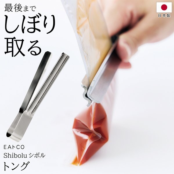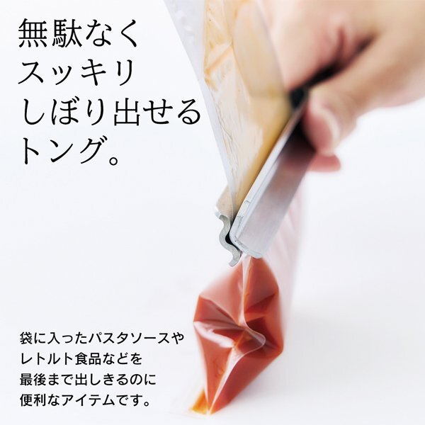 | ソースやレトルト食品を 最後まで残さず絞り出す! 握りやすいグリップのトングです。 |