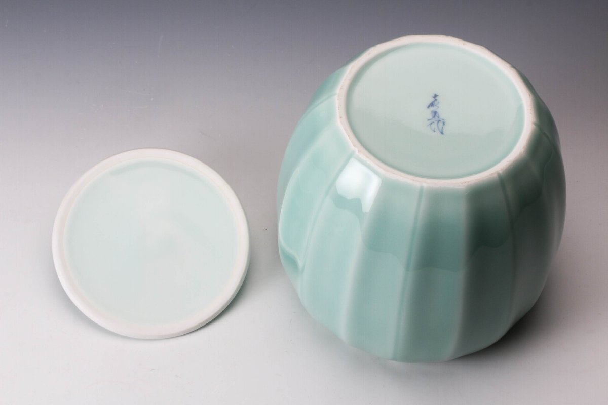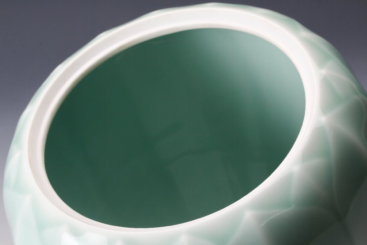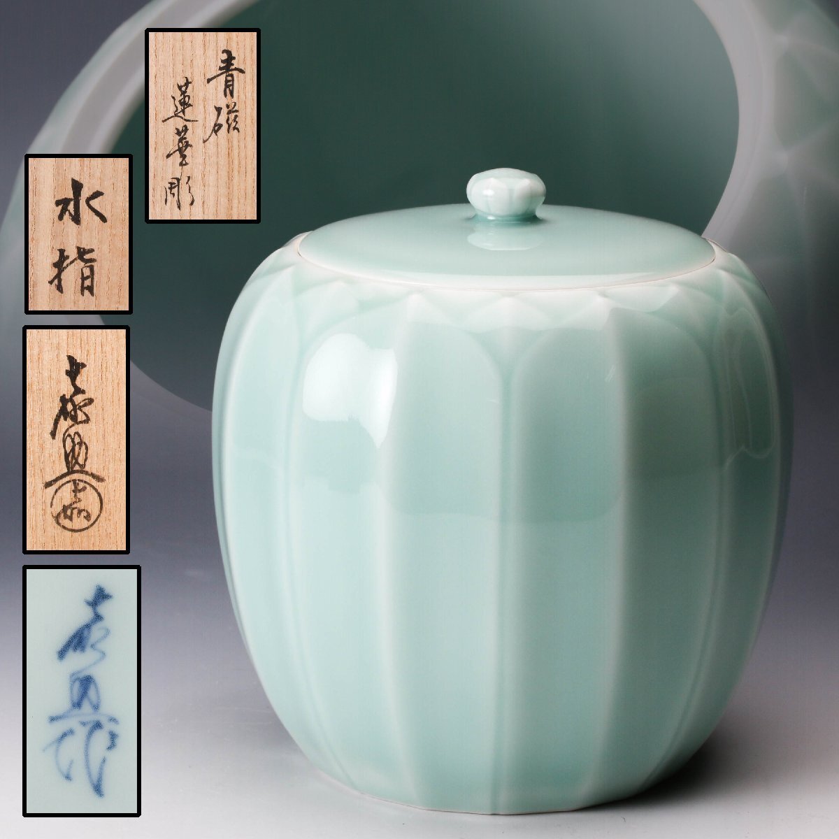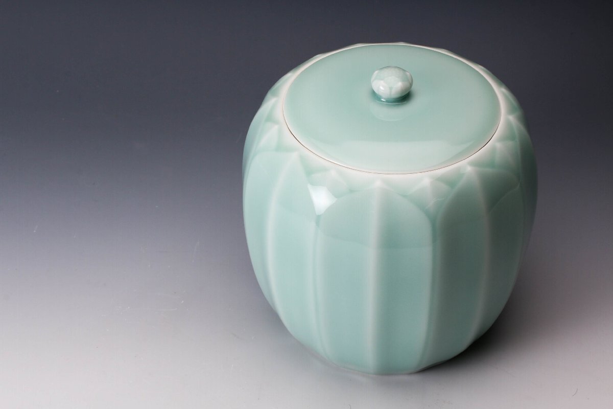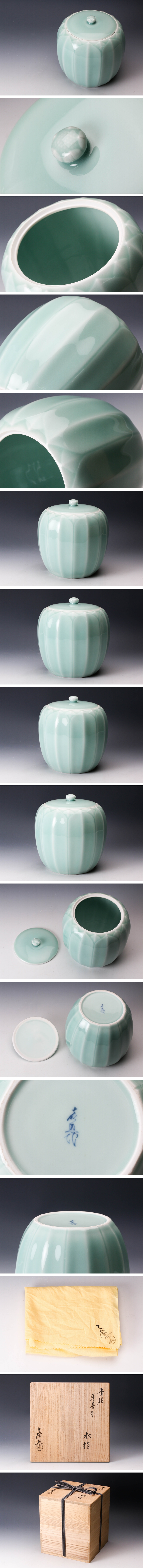 【佳香】十三代 横石嘉助 青磁蓮華彫水指 共箱 共布 茶道具 本物保証