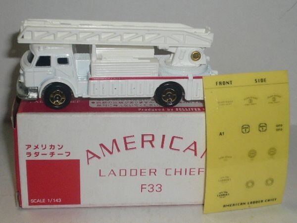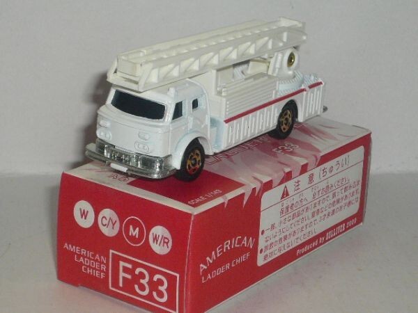 トミカ アメリカン ラダー チーフ F33(日本製)です。箱に少し傷みがありますので、ご了承の上入札下さい。商品の状況は写真でご判断の上、ノ-クレ-ム・ノ-リタ-ンでお願いします。保証はできませんが、定形外郵便での発送も可能です。