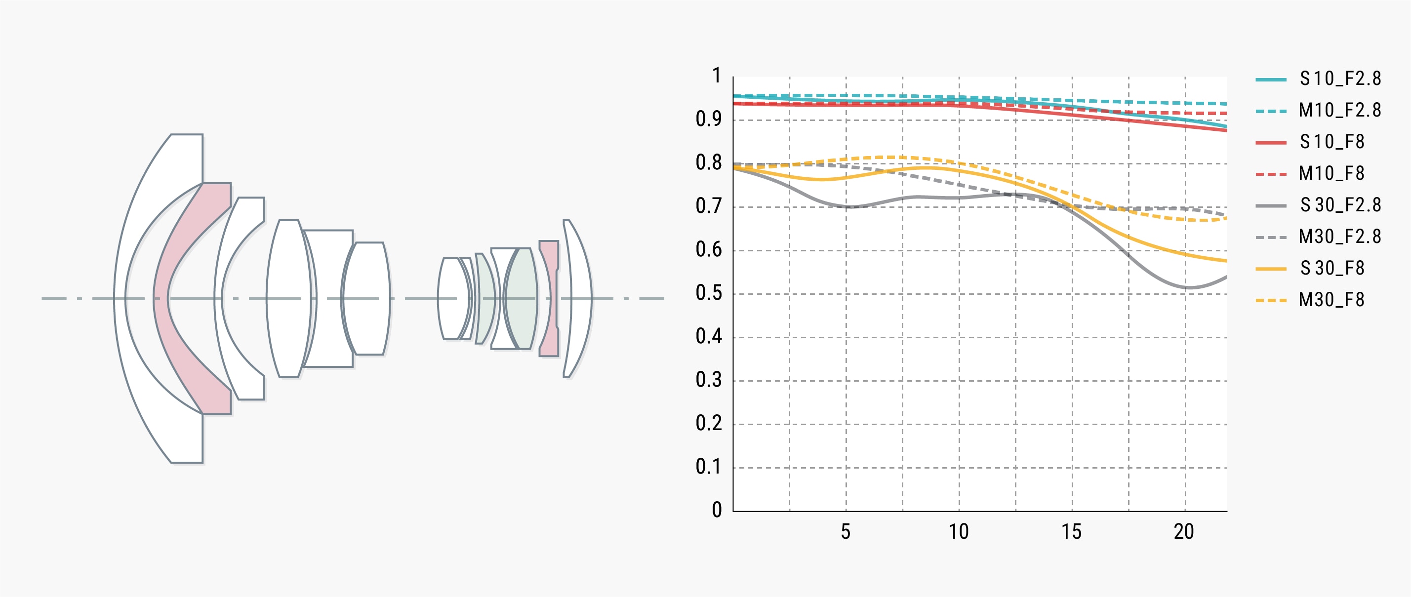114°の超広角 F2.8の大口径設計 高性能光学設計 使いやすさと耐久性を両立 レンズ構成(10群13枚)/ MTF図 仕様