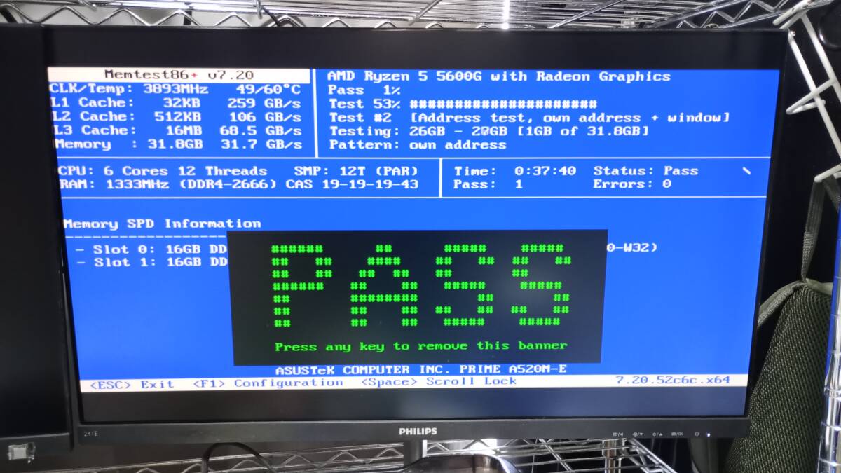 添付画像に取り外し直前のmemtest86+の画像を示します。エラーなく完走しております。