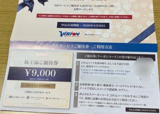 【コード通知】ビジョン Vision 株主優待券 9000円分 申込期限2026年9月末