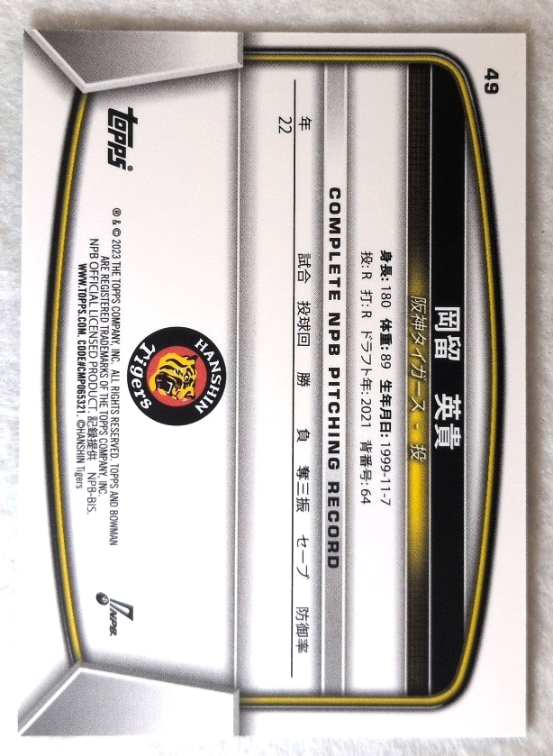 ★99枚限定★ 岡留英貴 阪神タイガース 23/99 TOPPS BOWMAN 2023