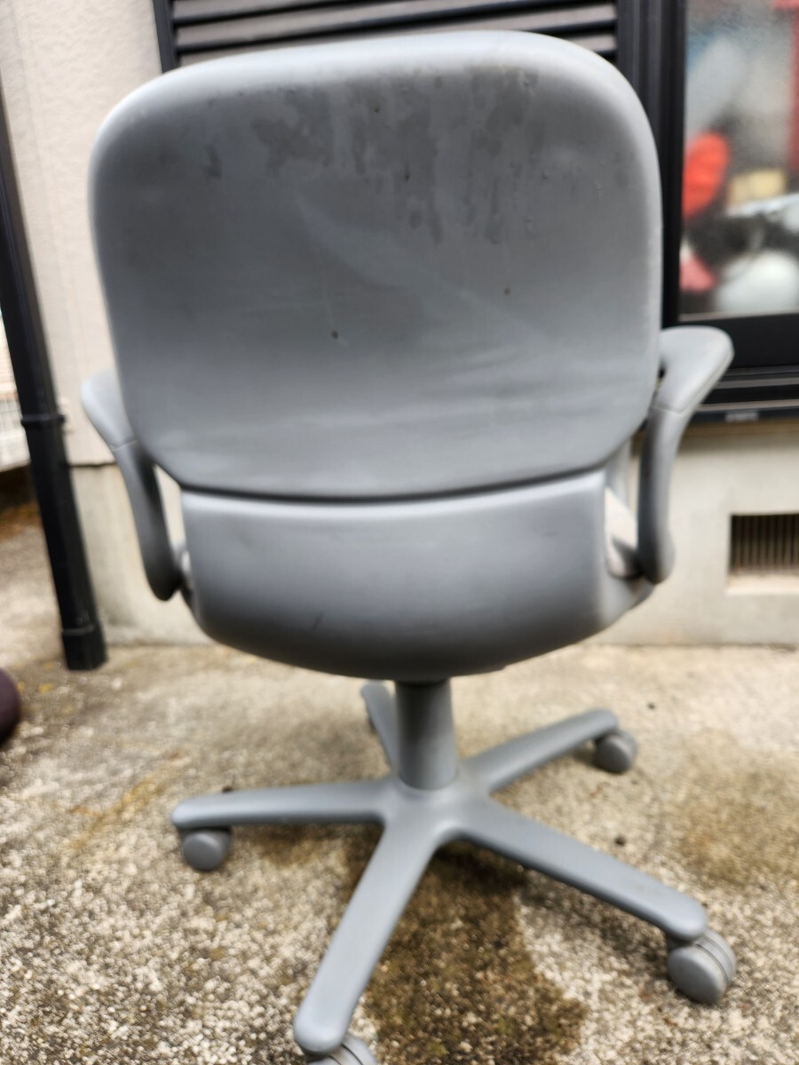 古いものですが、クッションはへたってませんので、まだまだ使えます。こちらは背もたれが低いタイプのものになります。昇降装置は付いていません。背中に重心を乗せると背もたれが動くタイプです。