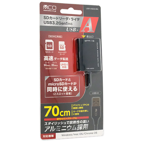 | ミヨシ SDカードリーダ・ライタ USB3.2Gen1対応 USB-A 70cm USR-ASD2/BK | |