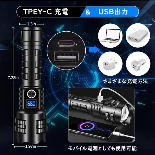 LED懐中電灯 強力 超高輝度 50000ルーメン フラッシュライト 充電式 懐中電灯 led 強力 軍用 最強 ハンディライト XHP99 超強力ライト