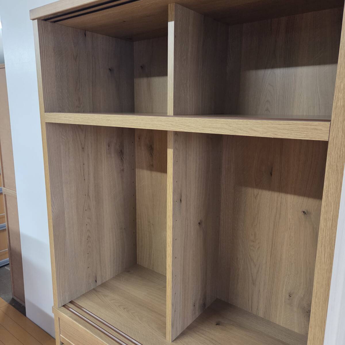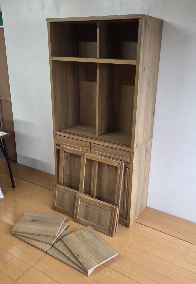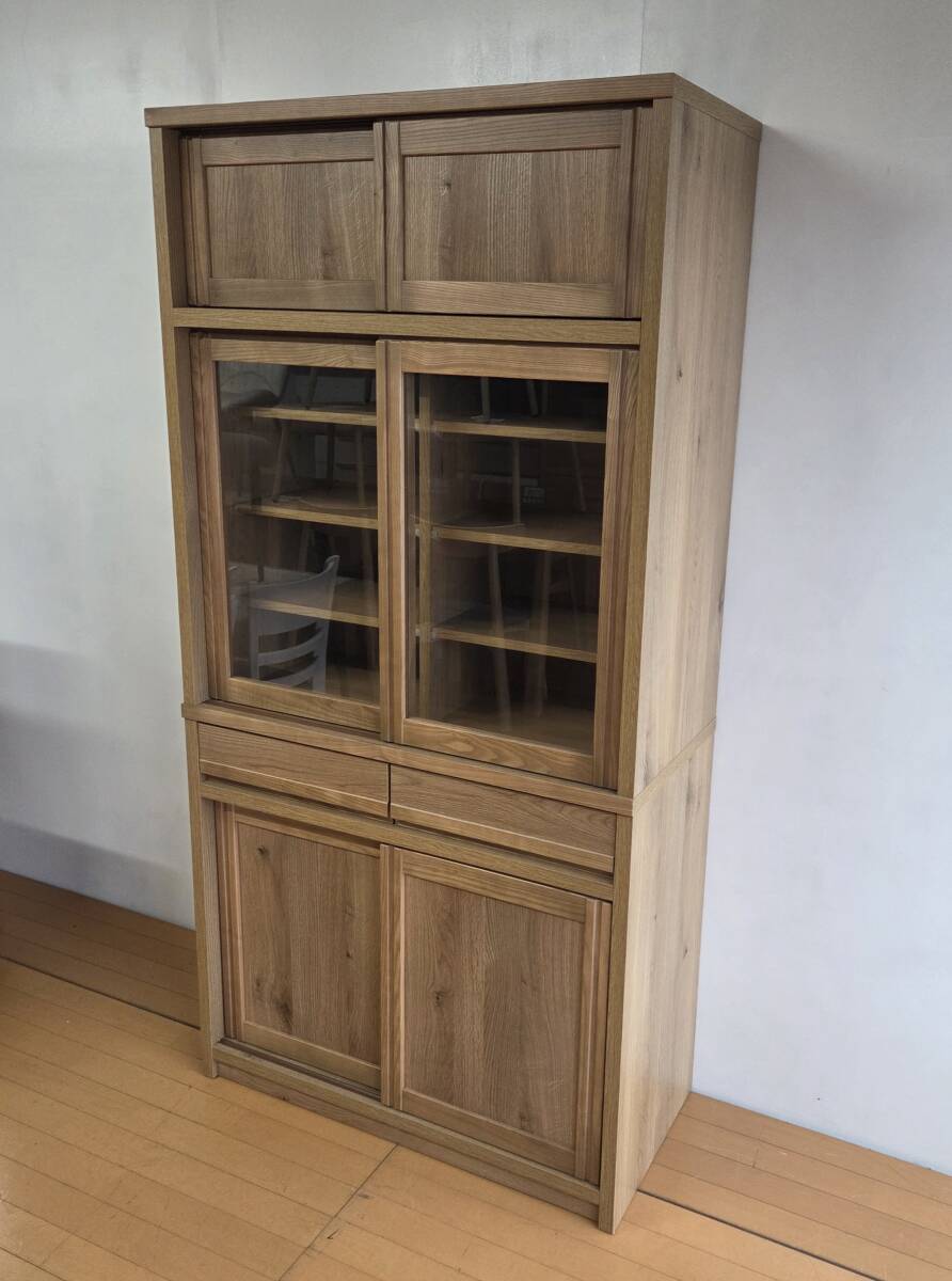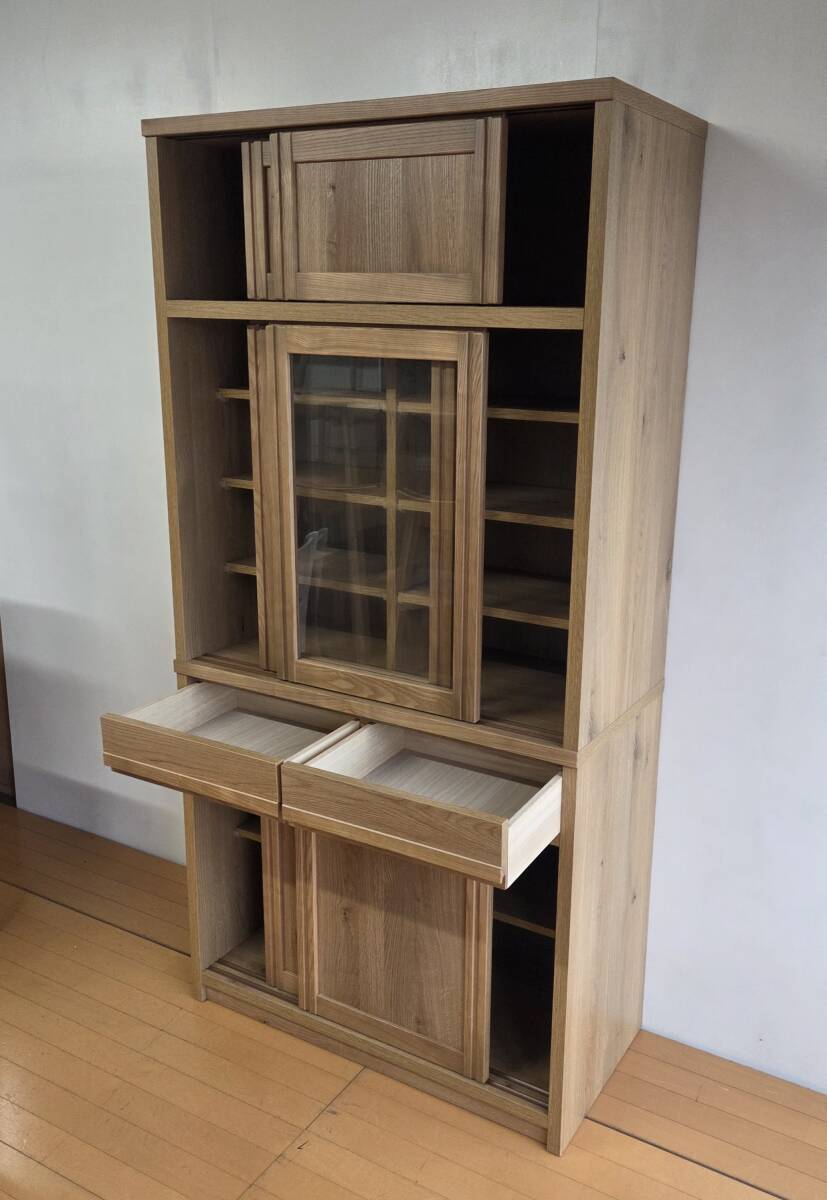 未使用 美品 食器棚 幅90 高さ180 ナチュラル ガラス引戸 引出 レンジ台 引出し 棚 大量収納 天然木 キッチンストッカー