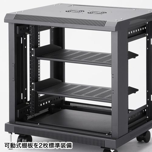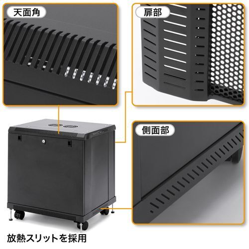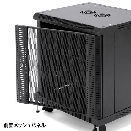 ※配送の送り主はサンワサプライ(株)と記載されています。沖縄・離島配送不可となります。 当店は正規販売代理店です。 特長 AV機器の収納に便利です。ハブやHDDなどの小型機器の収納にも最適です。 前扉、バックパネルには標準で鍵を装備。セキュリティ対策ができます。 前面には通気性のよいメッシュパネルを、天面角、側面、背面、扉部にはスリットを採用しているため、放熱性に優れています。 棚板2枚が標準装備です。 熱対策用の放熱ファンの装着が可能です。(最大2台まで) ※CP-FANS、CP-SFANSを別途ご購入下さい。 19インチマウントフレームはEIA規格ユニバーサルピッチを採用し、ケージナットに対応しています。 ※19インチマウントフレームは前方のみ マウント数は11Uです。 <ご注意> ※キャスターは長距離の移動を想定したものではありません。機器を乗せたままでの移動は行わないでください。 気をつけておりますが、タイミングによっては在庫切れの場合があります。 仕様