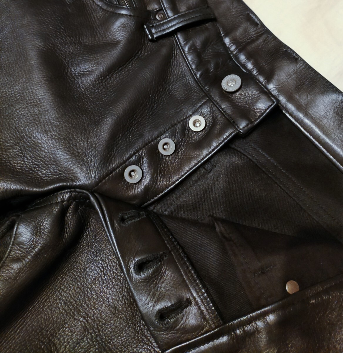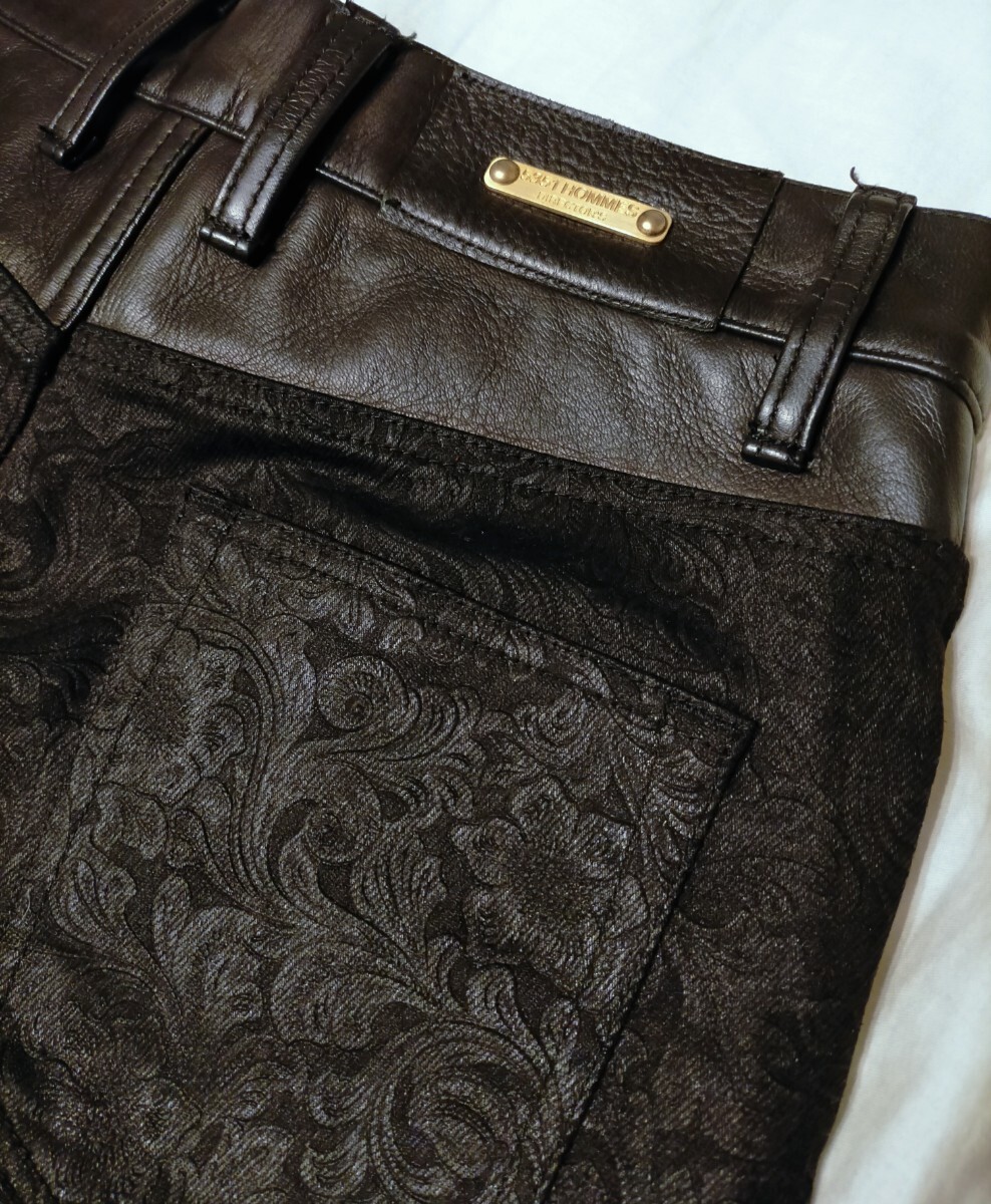 吸い付くように滑らかで柔らかい質感の高級ディアレザーを用いたレザーパンツで、前身頃の鹿革のシボ感と美しい艶感、後身頃のフラワー総柄デニムの立体感と光沢感が相まって非常に高級感溢れる差別化された仕上がりになっております。