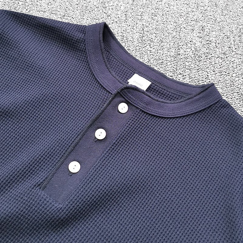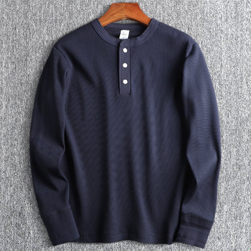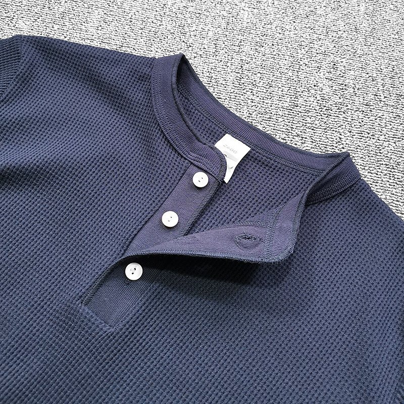 新品 欧米 ワッフル カットソー ニット ヘンリーネック 長袖Tシャツ メンズ 薄手 綿混 春秋 快適 無地  カジュアル スポーツ
